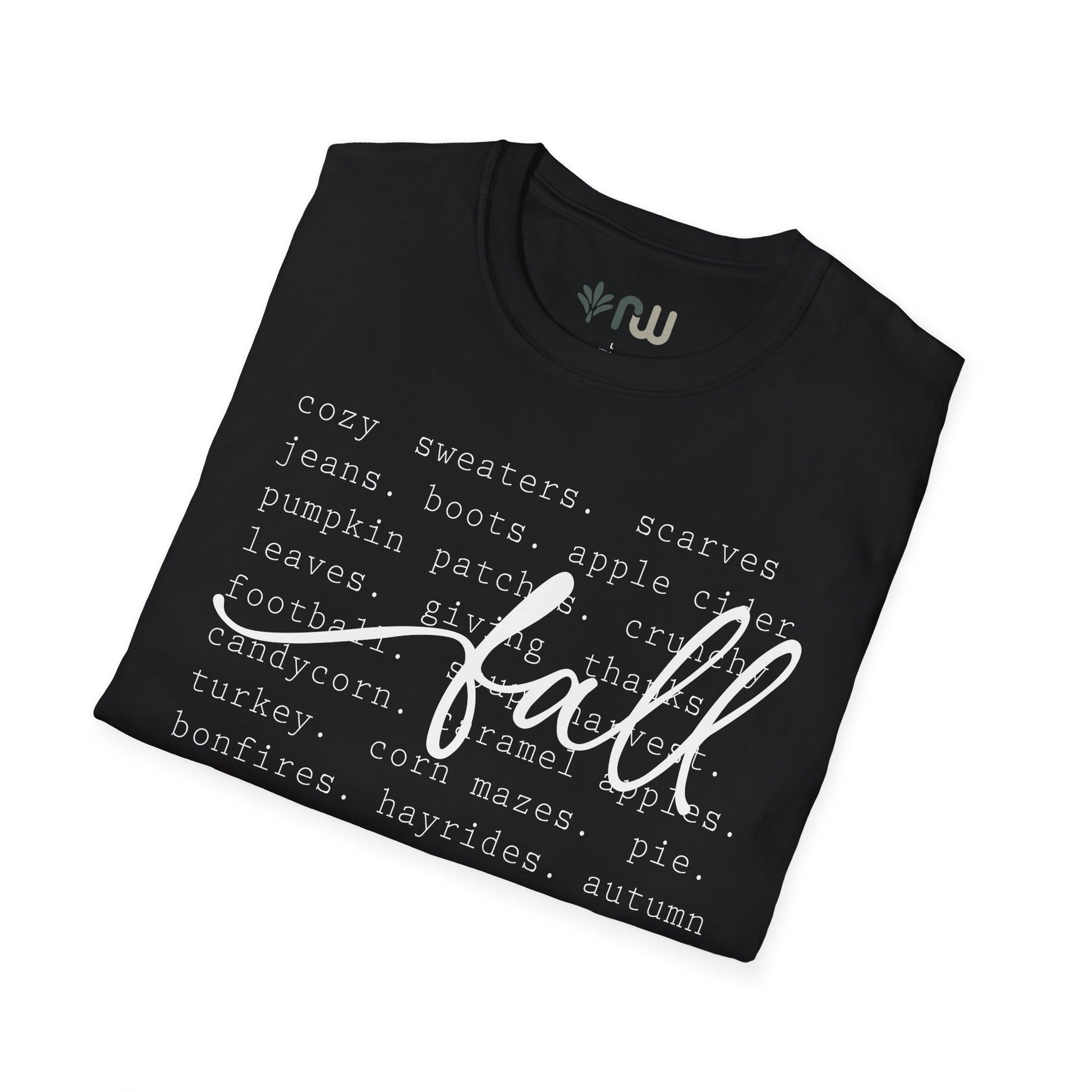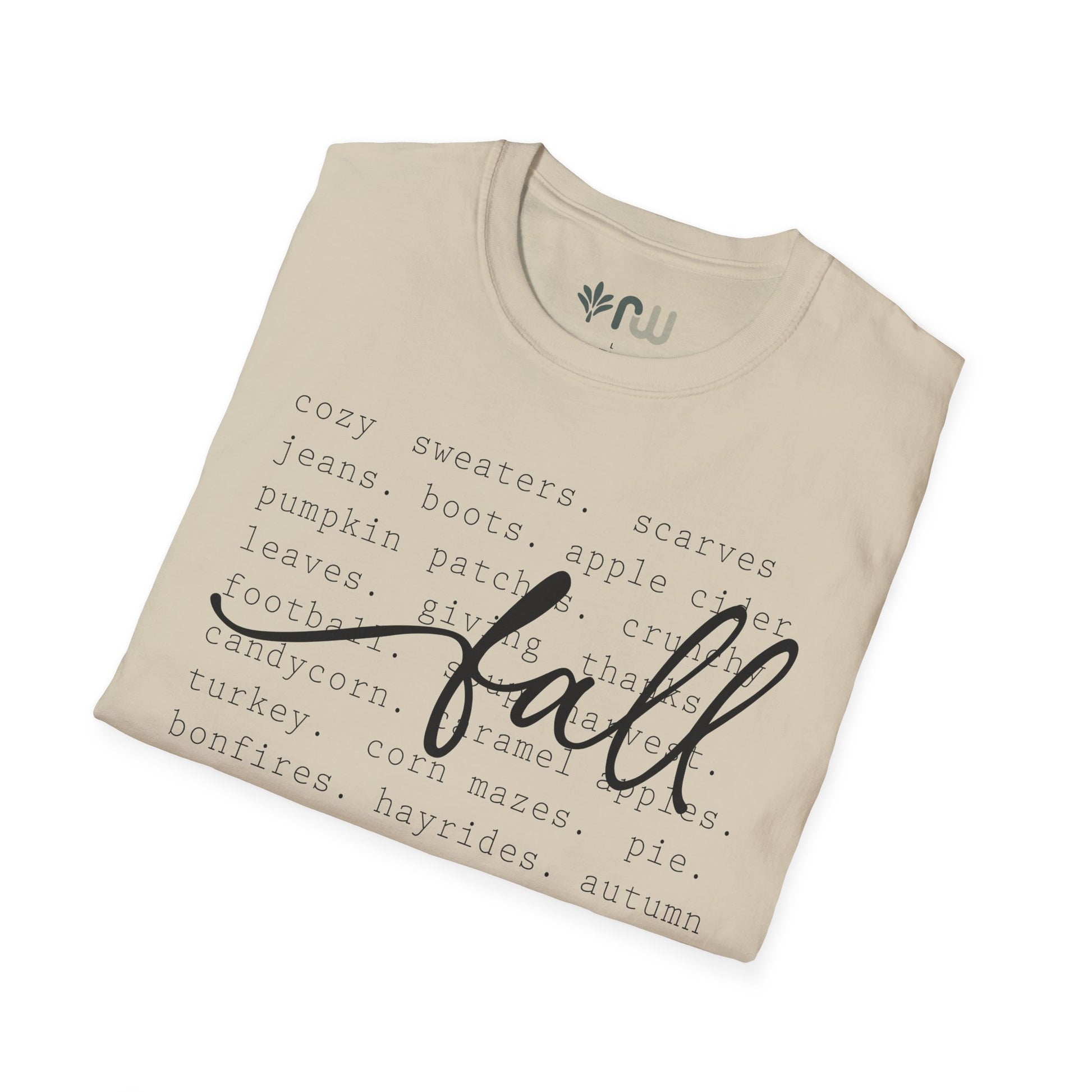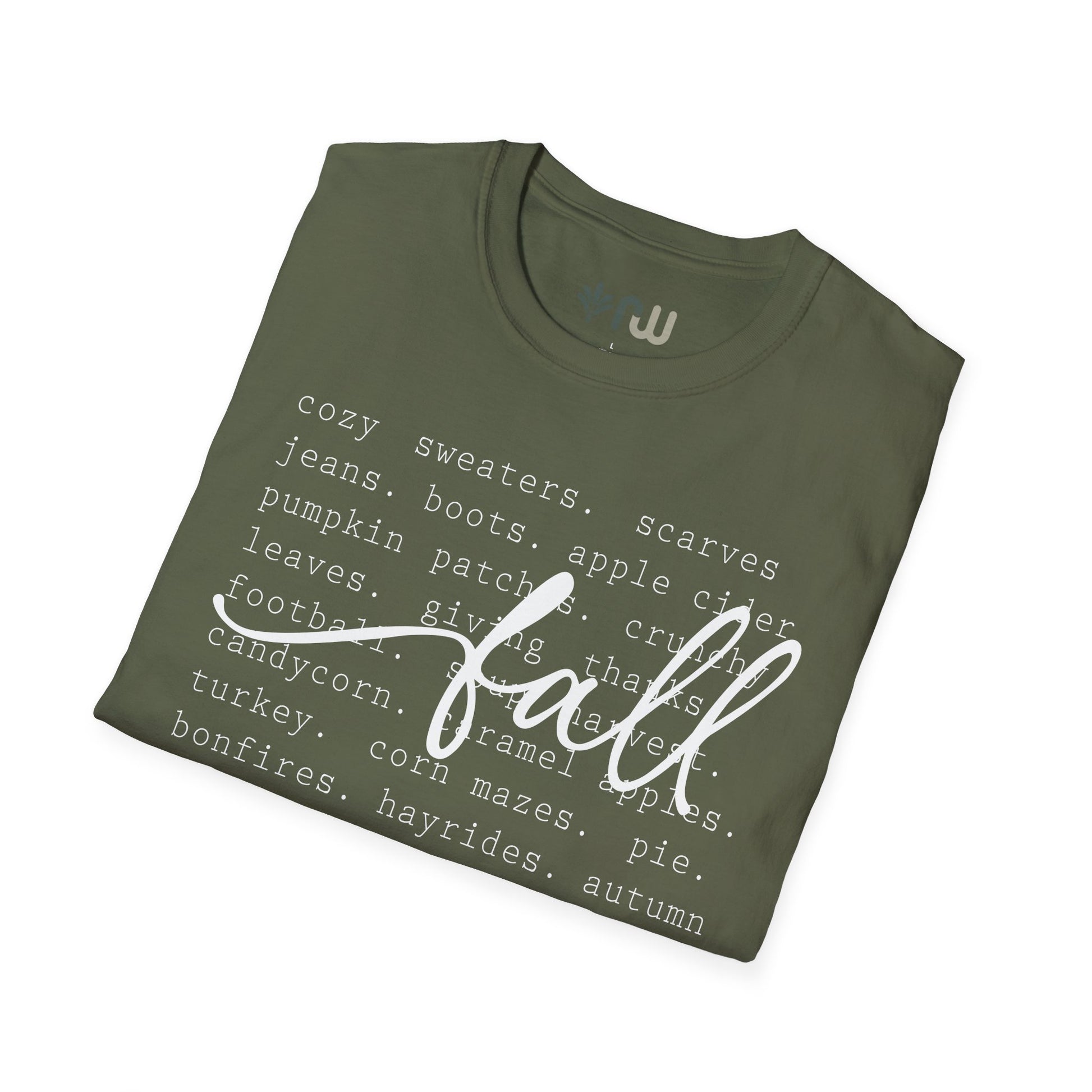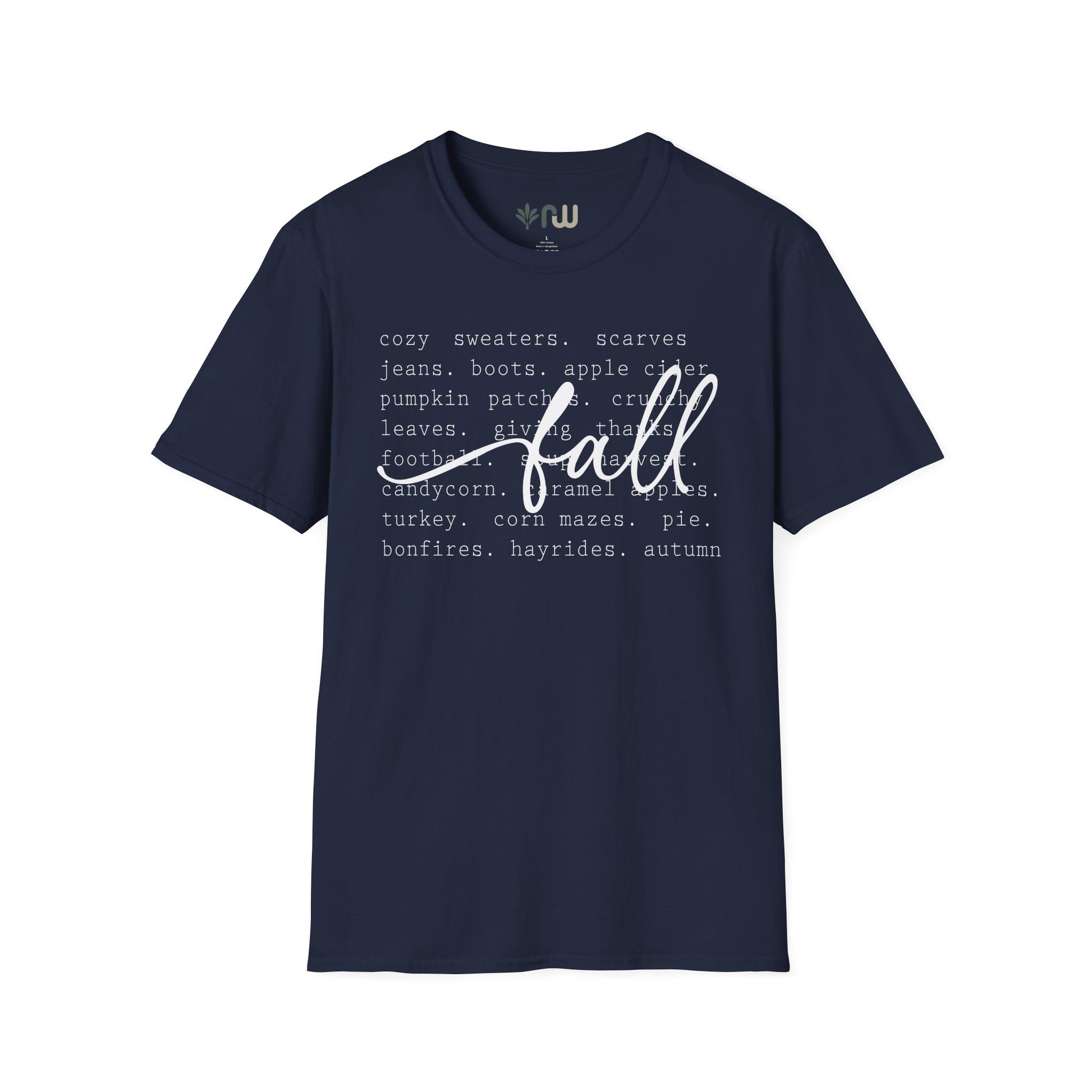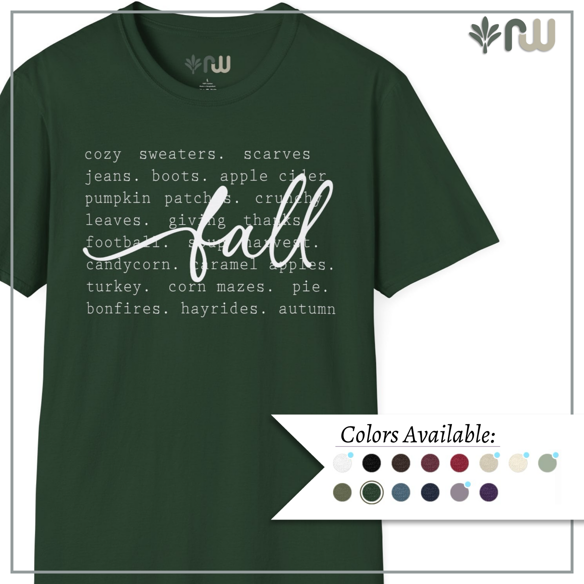 Celebrate the magic of autumn with our "All Things Fall" T-shirt, a cozy tribute to the season’s charm. Crafted from soft, breathable cotton, this unisex tee ensures all-day comfort and a perfect fit. The vibrant graphic features the word "Fall" in elegant script font, layered over a backdrop of words celebrating autumn’s essence. This design captures the spirit of fall’s transformation and beauty. Ideal for layering on chilly days or gifting to fellow fall lovers, this T-shirt is a stylish way to embrace nature’s seasonal glow.