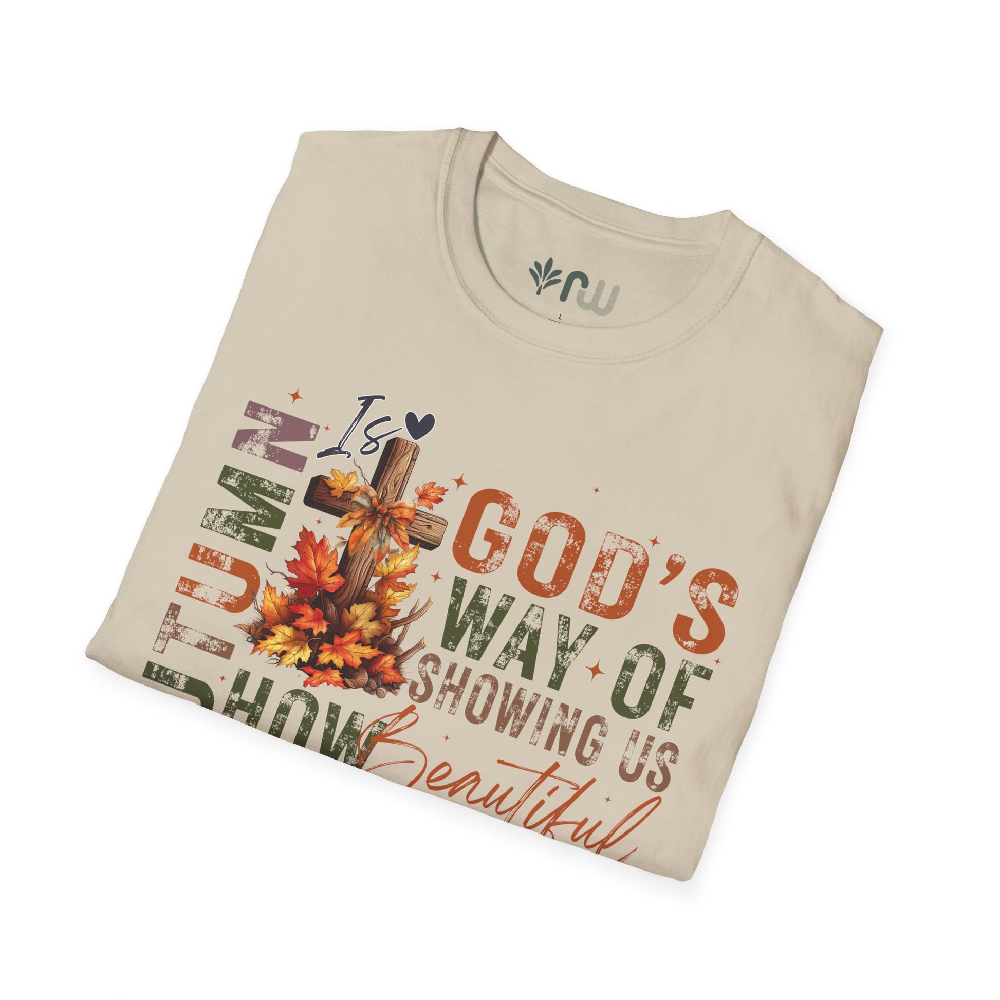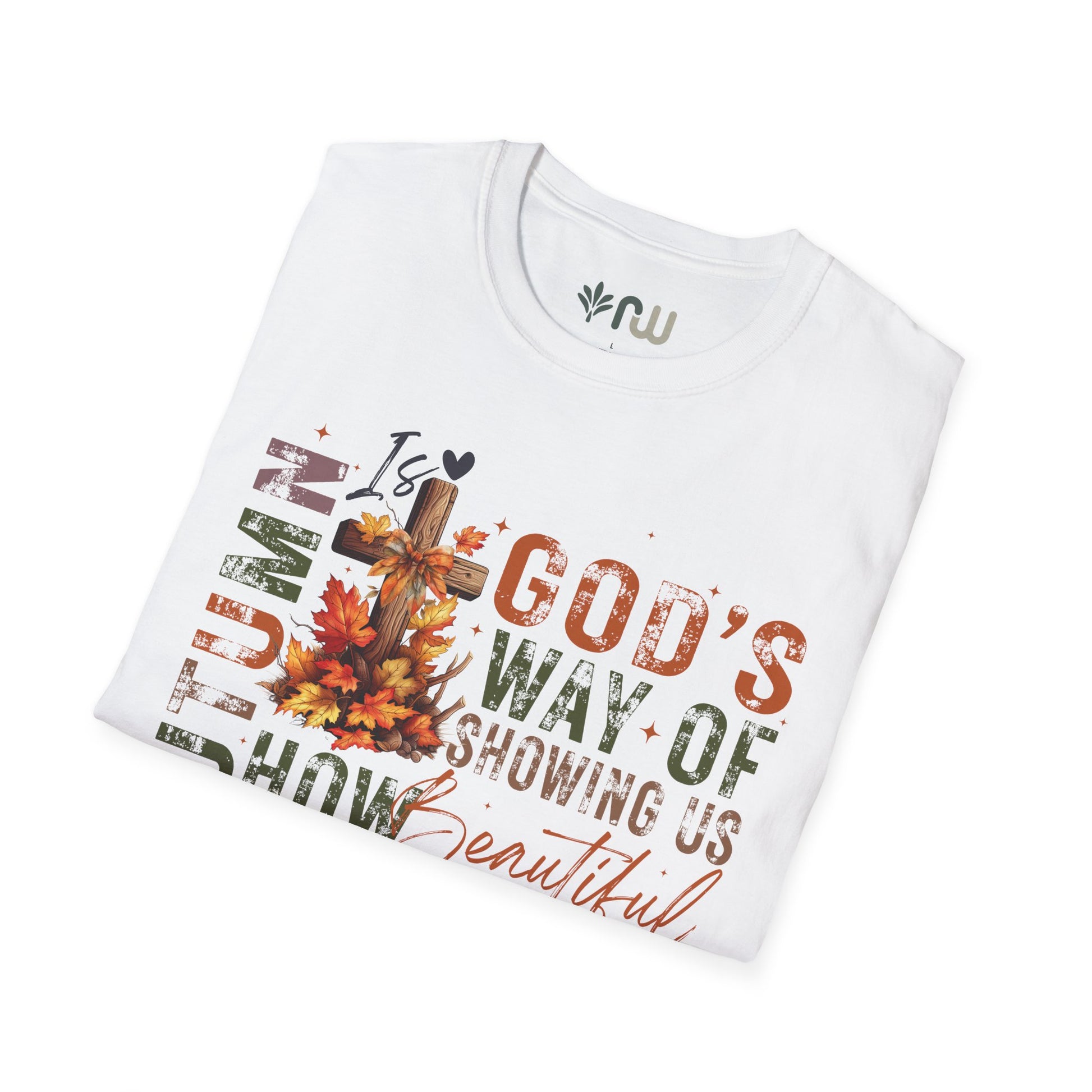Celebrate the beauty of the fall season with our cozy "Autumn is God's Way of Showing Us How Beautiful Change Can Be" T-shirt. Crafted from soft, breathable cotton, this unisex tee offers a comfortable fit for all-day wear. The vibrant, autumn-inspired design features warm hues and artful typography, showcasing the heartfelt message that captures the essence of transformation and renewal. Perfect for layering during crisp fall days or gifting to loved ones, this T-shirt is a stylish reminder of nature’s stunning seasonal shift.