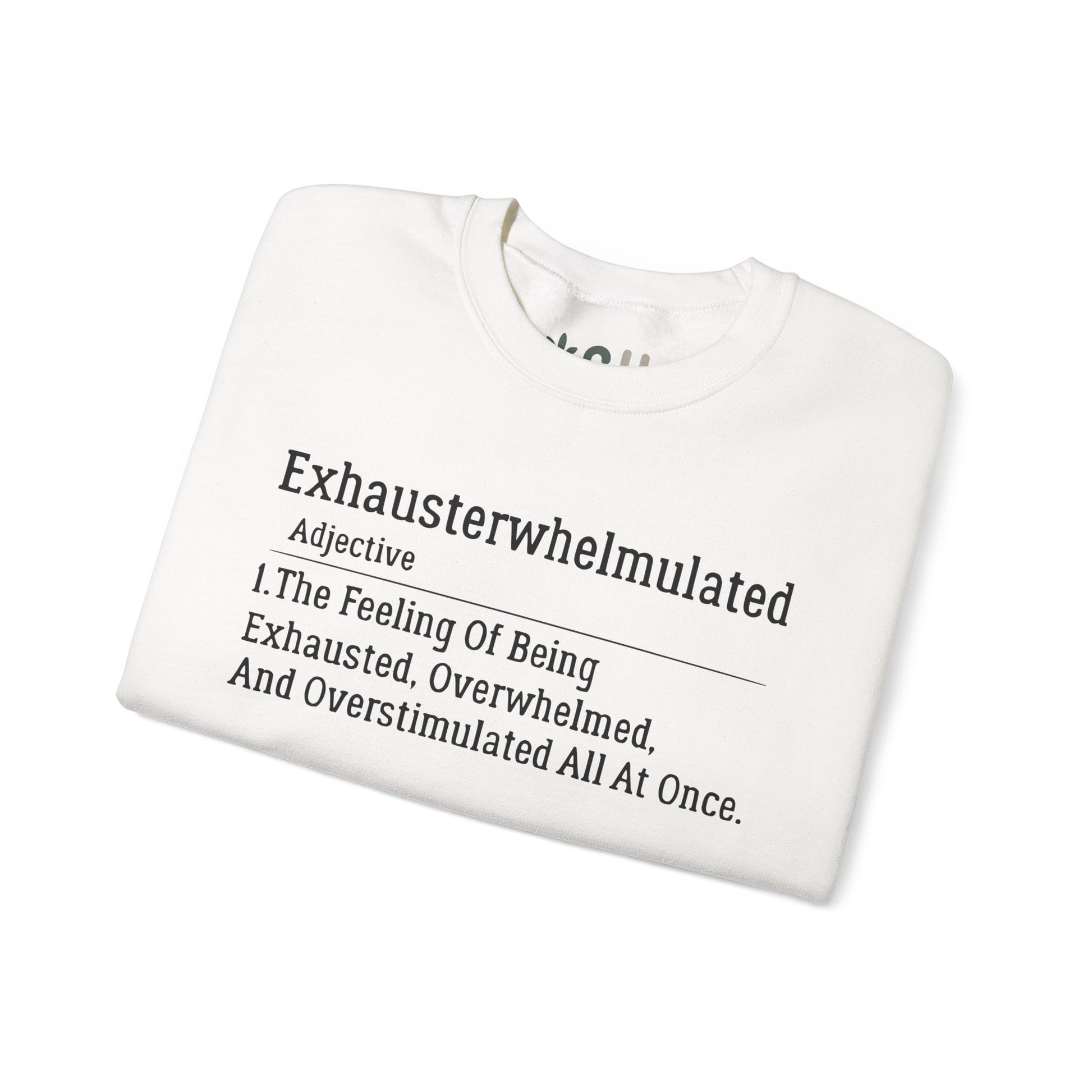 Wrap yourself in relatable humor with our "Exhausterwhelmulated" crewneck sweatshirt, a cozy nod to life’s chaotic moments. Crafted from soft, breathable cotton-blend fabric, this unisex sweatshirt delivers all-day comfort and a relaxed fit. The witty design features the word "Exhausterwhelmulated" in bold text, defined as "the feeling of being exhausted, overwhelmed, and overstimulated all at once," ideal for anyone juggling too much. Perfect for chilly days or gifting to a fellow overworked friend, this crewneck blends style with a clever take on modern stress.