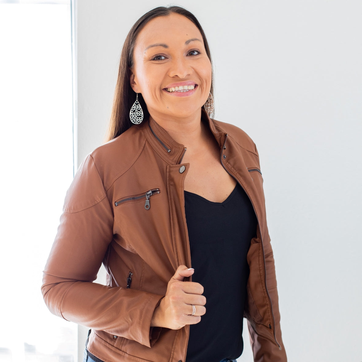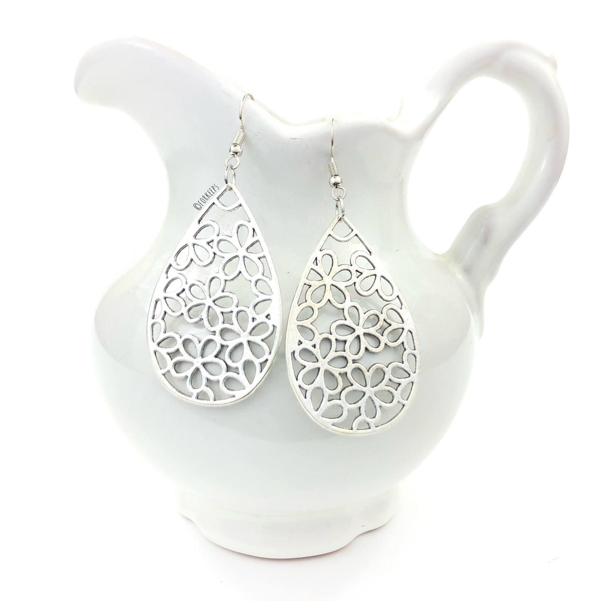 Silver teardrop earrings with floral lattice design.