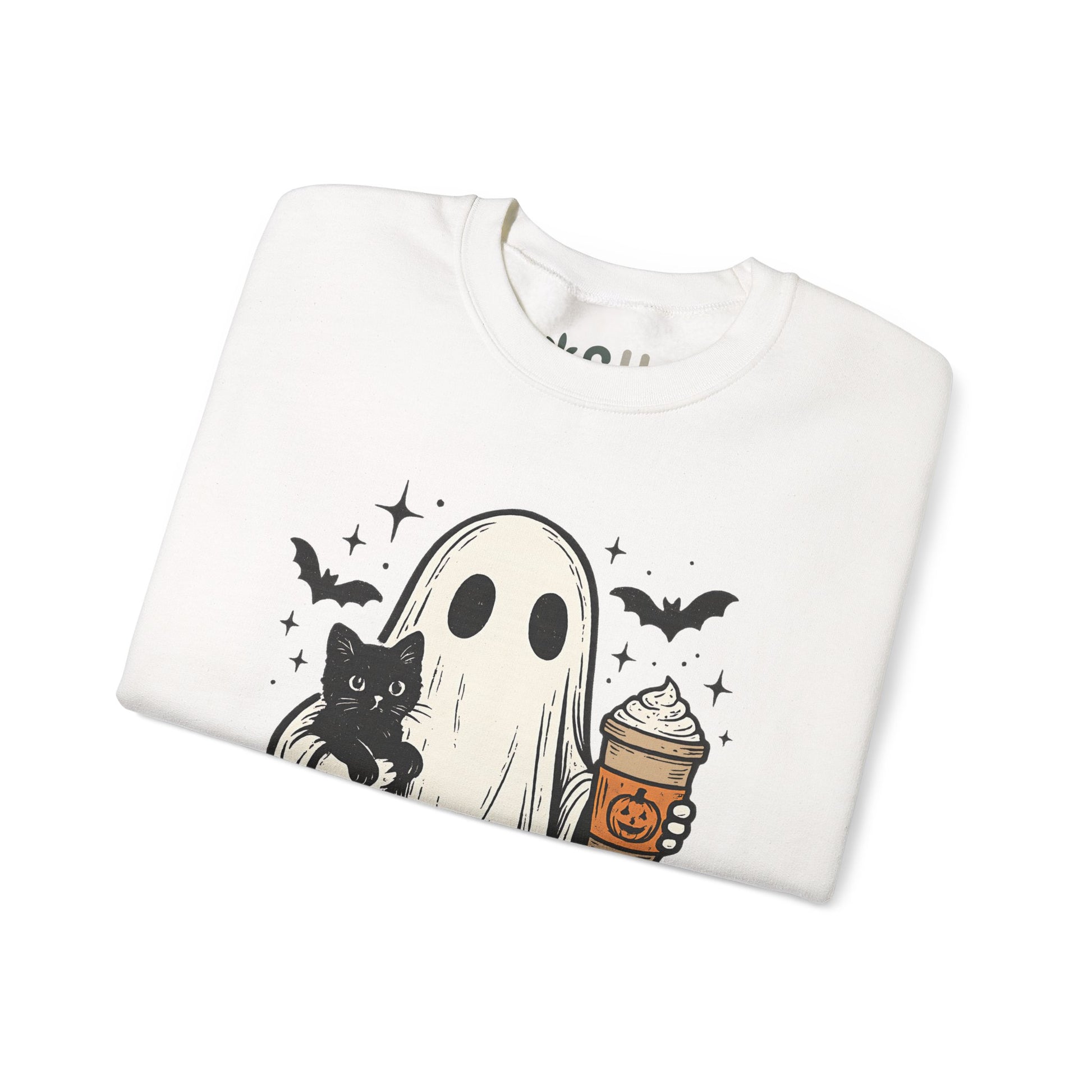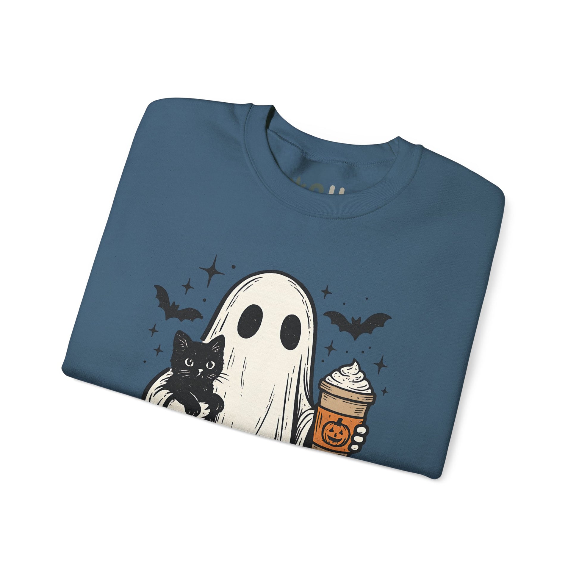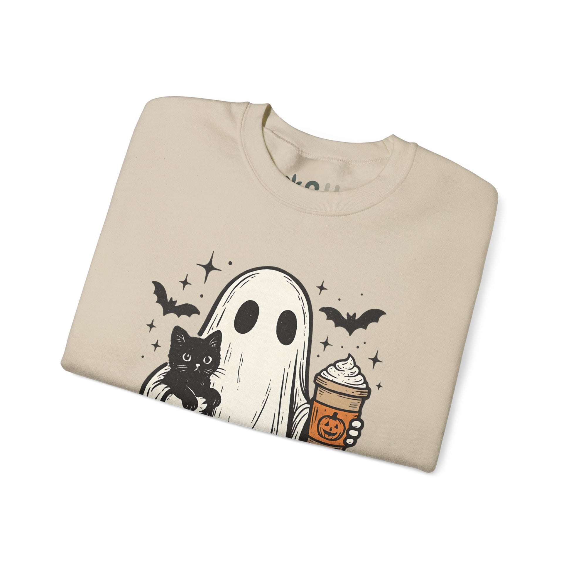 Cozy up for the spooky season with our "Ghost, Cat and Latte" crewneck sweatshirt, inspired by the cozy and eerie charm of Halloween. This stylish sweatshirt features a whimsical illustration of a ghost cradling a cat while holding a pumpkin latte, blending cute and creepy in perfect harmony. Crafted from soft, comfortable fabric, this crewneck is ideal for chilly autumn days, whether you're sipping a pumpkin spice latte or embracing the Halloween spirit by the fire. Wear it, love it, and haunt the season in style!
