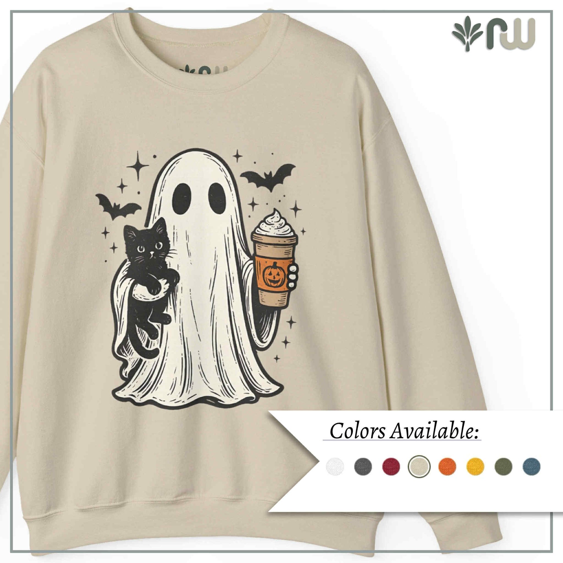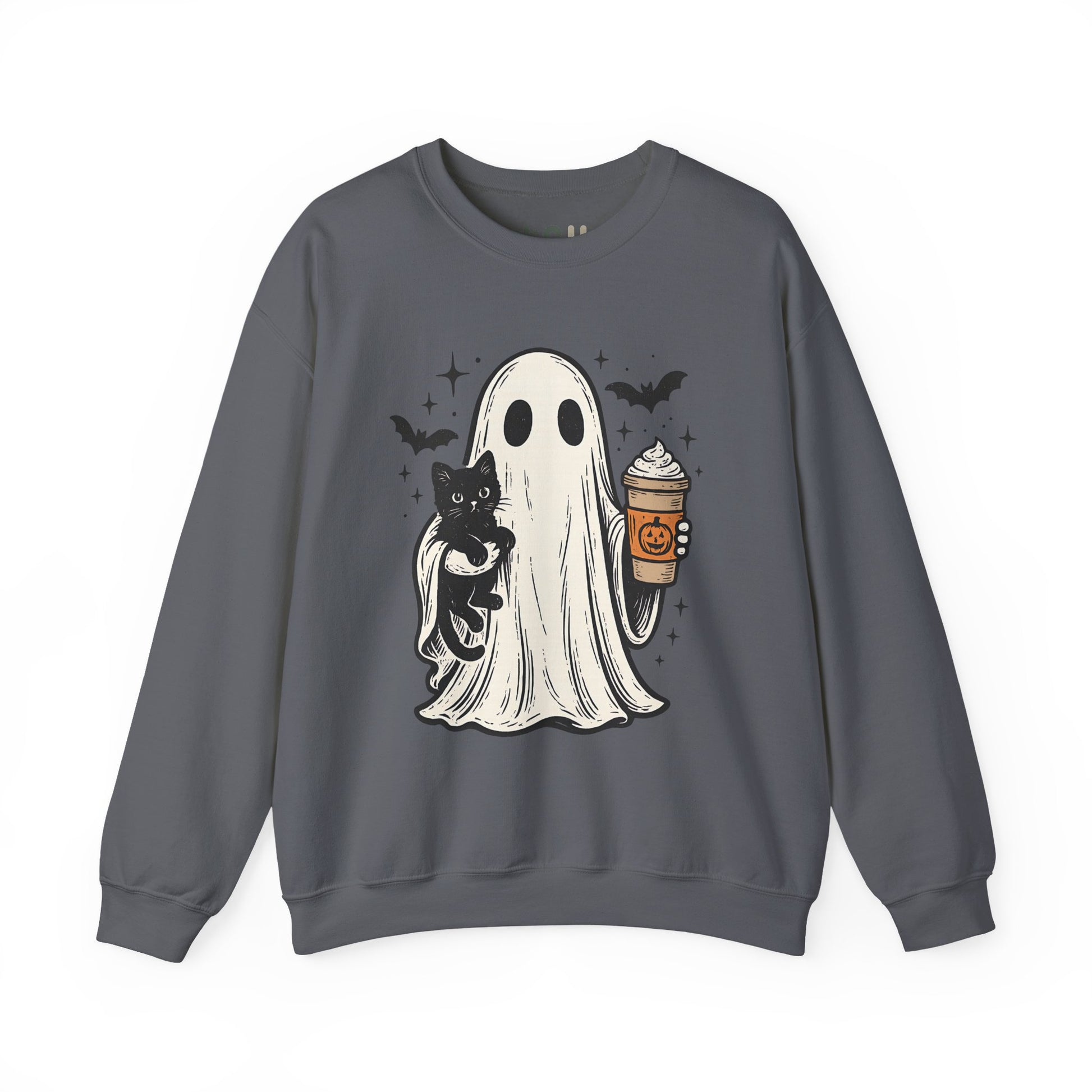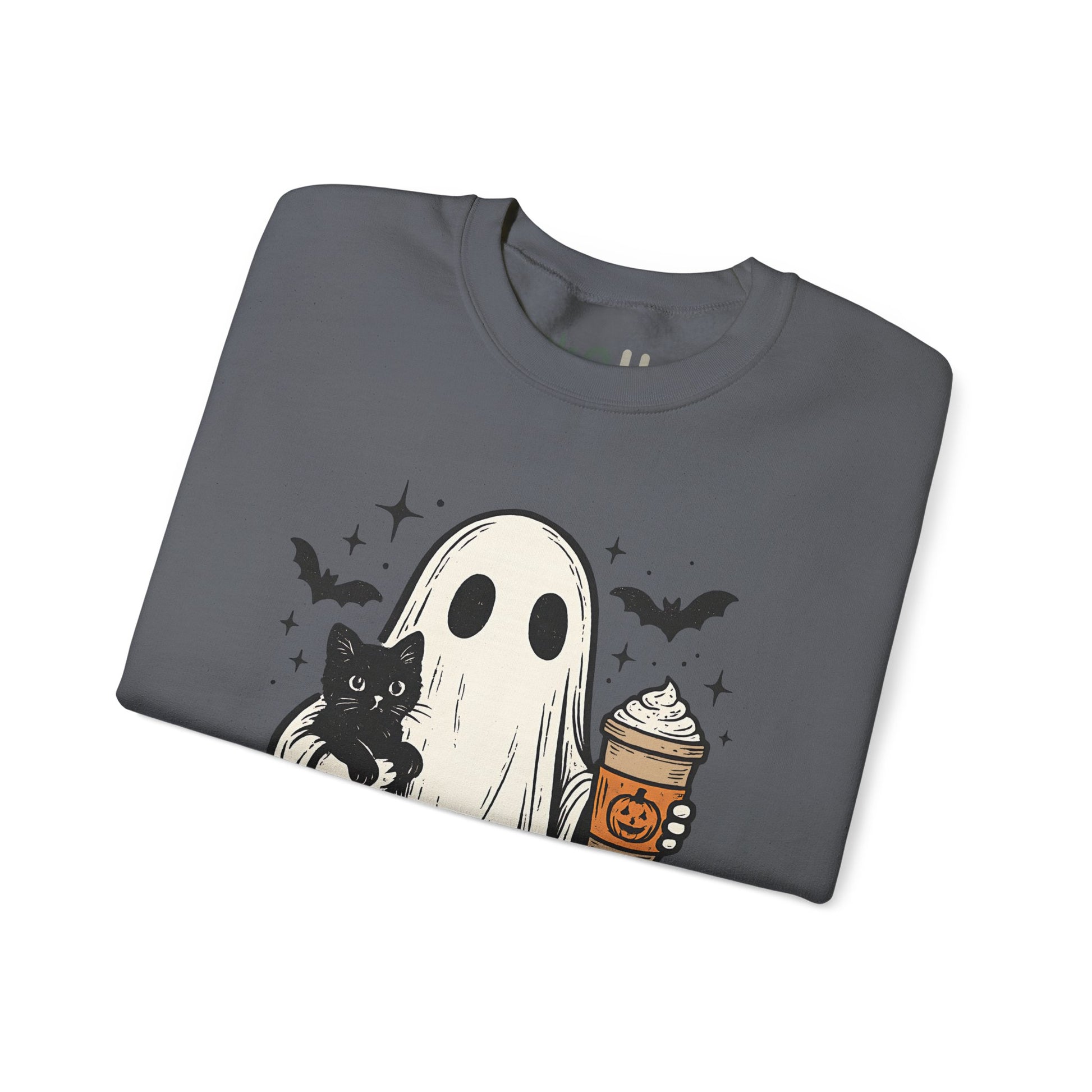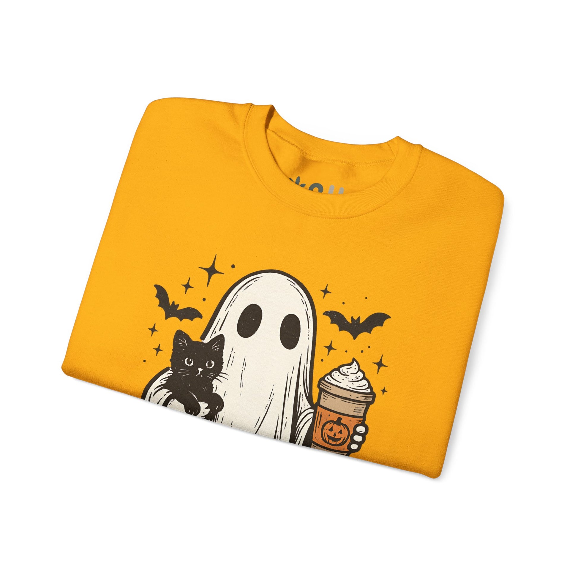 Cozy up for the spooky season with our "Ghost, Cat and Latte" crewneck sweatshirt, inspired by the cozy and eerie charm of Halloween. This stylish sweatshirt features a whimsical illustration of a ghost cradling a cat while holding a pumpkin latte, blending cute and creepy in perfect harmony. Crafted from soft, comfortable fabric, this crewneck is ideal for chilly autumn days, whether you're sipping a pumpkin spice latte or embracing the Halloween spirit by the fire. Wear it, love it, and haunt the season in style!