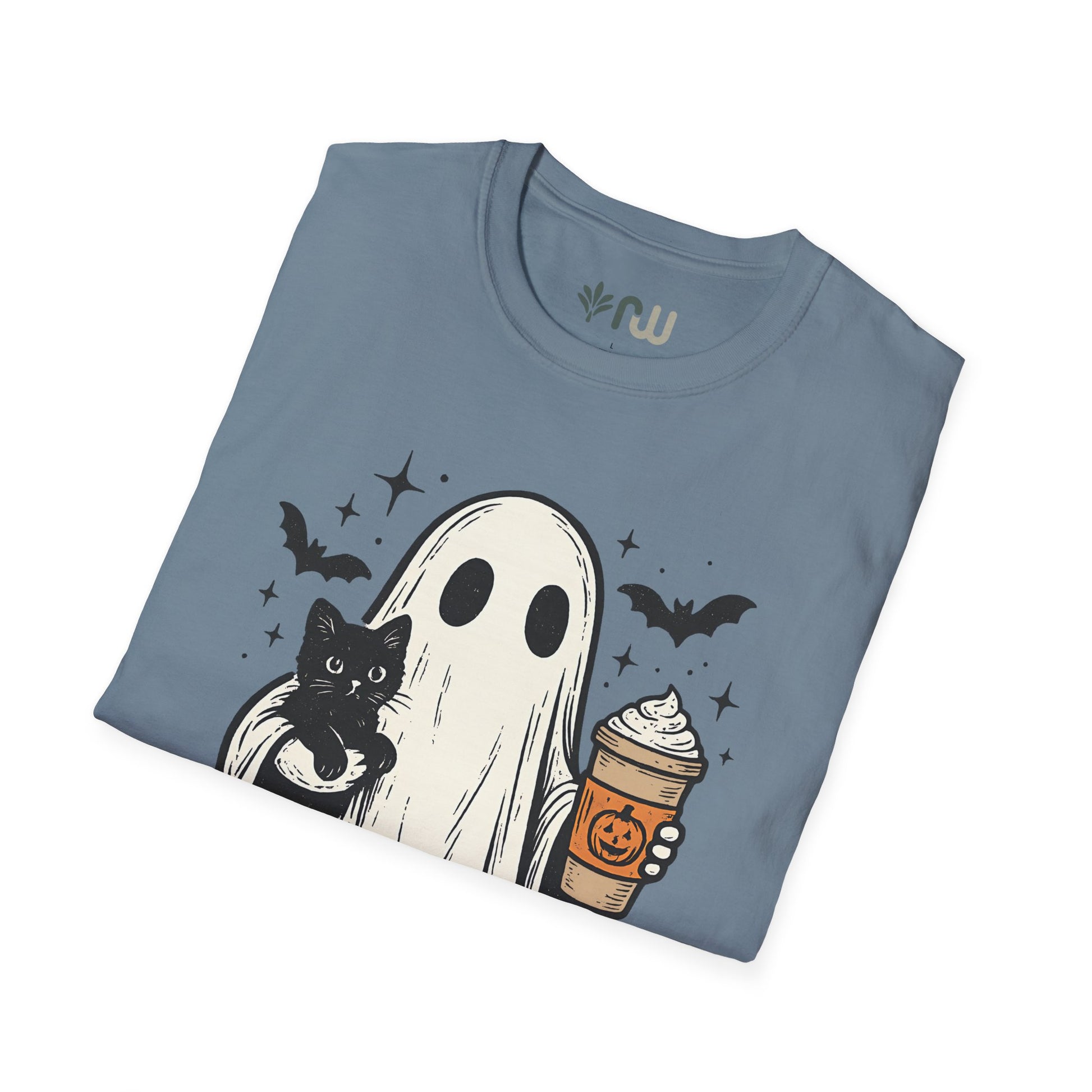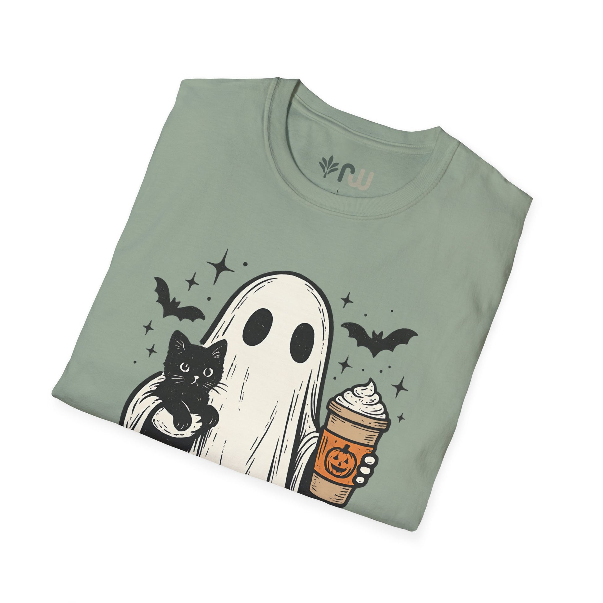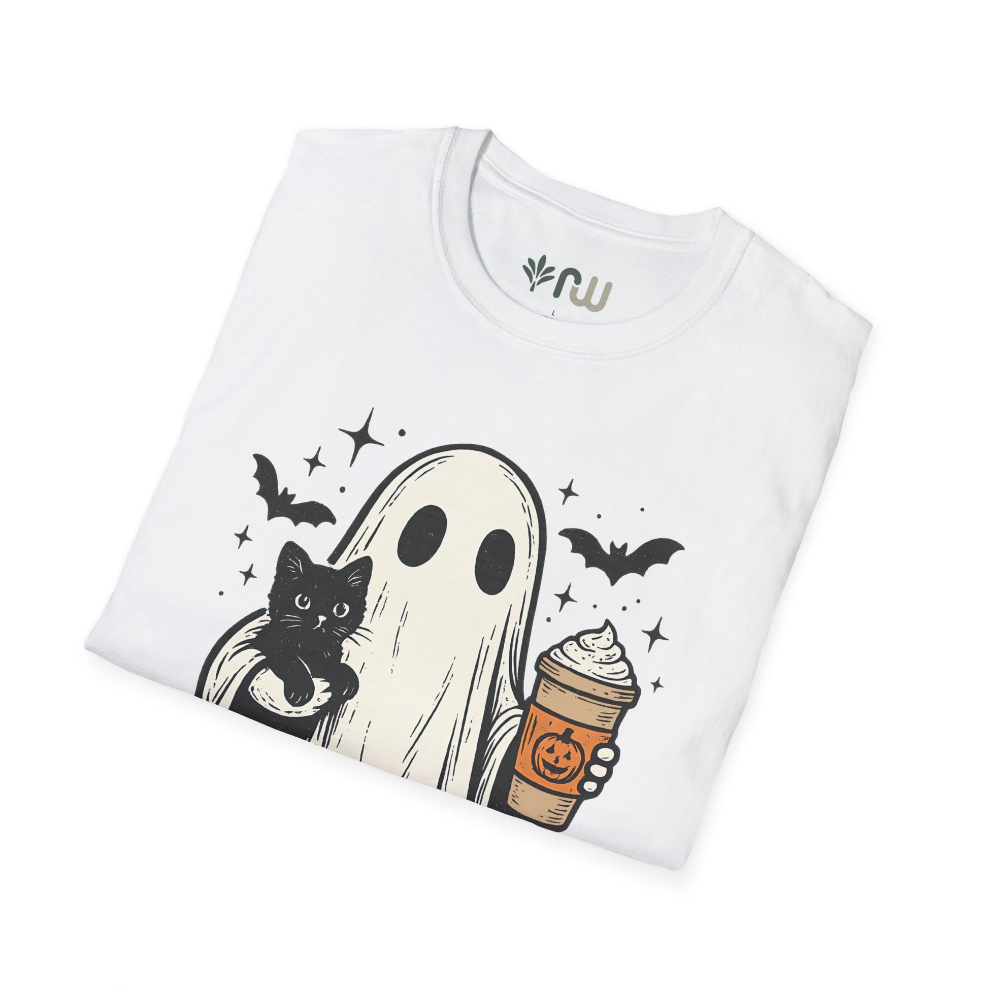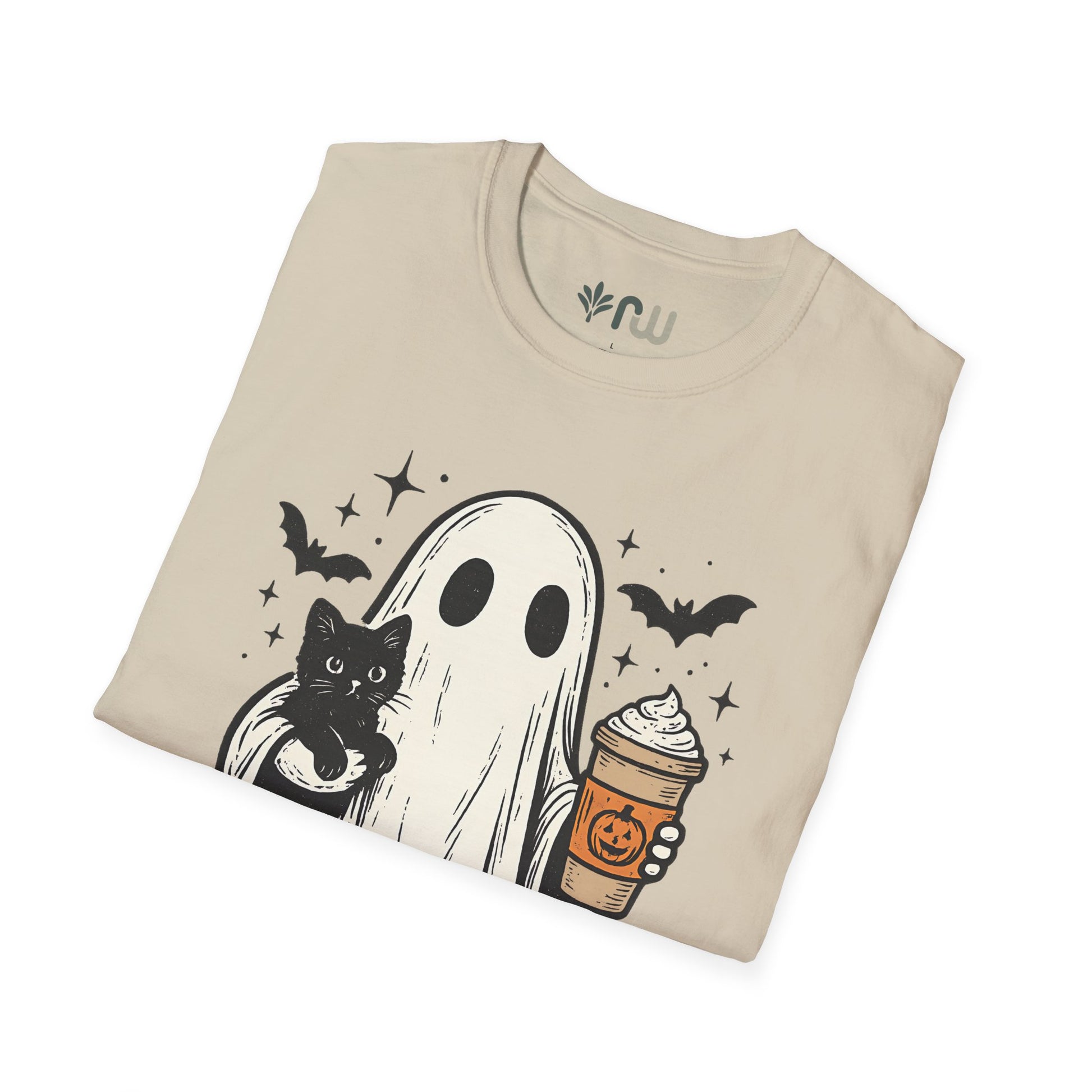 Embrace the spooky spirit of fall with this T-shirt, inspired by the cozy and eerie charm of Halloween. This stylish tee features a whimsical illustration of a ghost cradling a cat while holding a pumpkin latte, capturing the perfect blend of cute and creepy. Crafted from soft, comfortable fabric, this T-shirt is ideal for crisp autumn days, whether you're sipping a pumpkin spice latte or reveling in the Halloween season. Wear it, love it, and haunt the season in style!