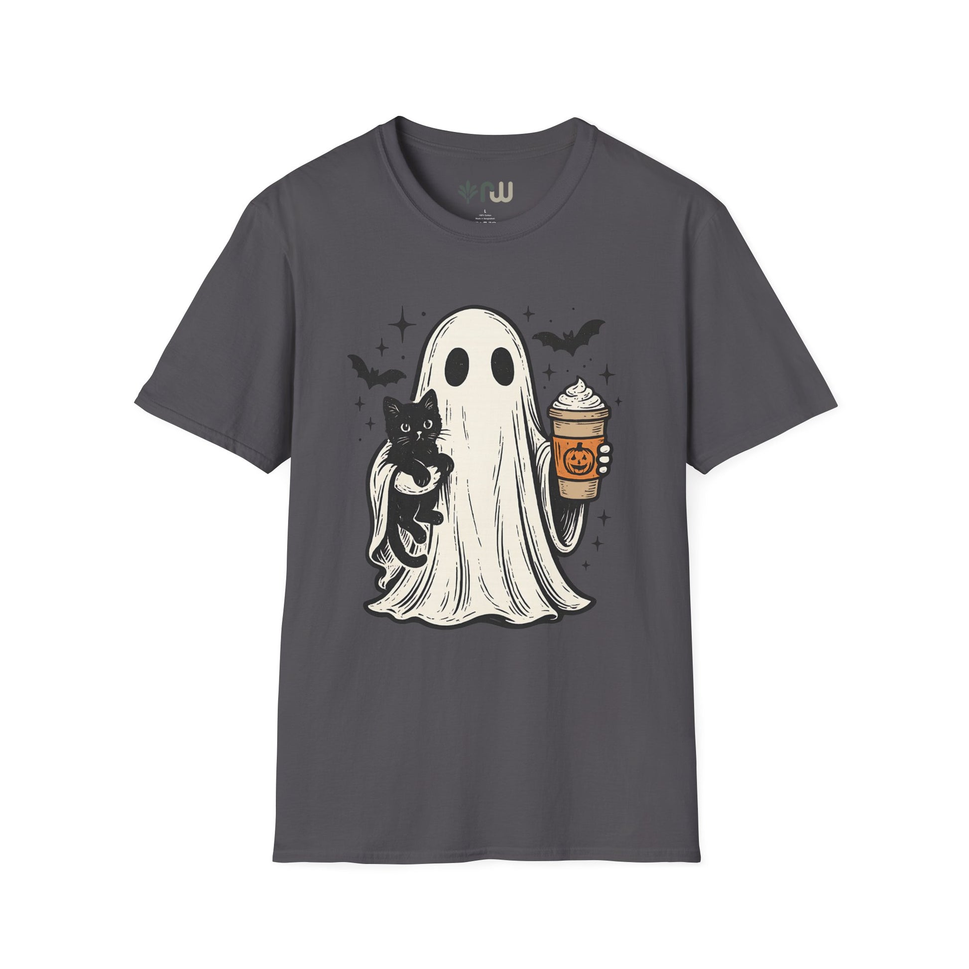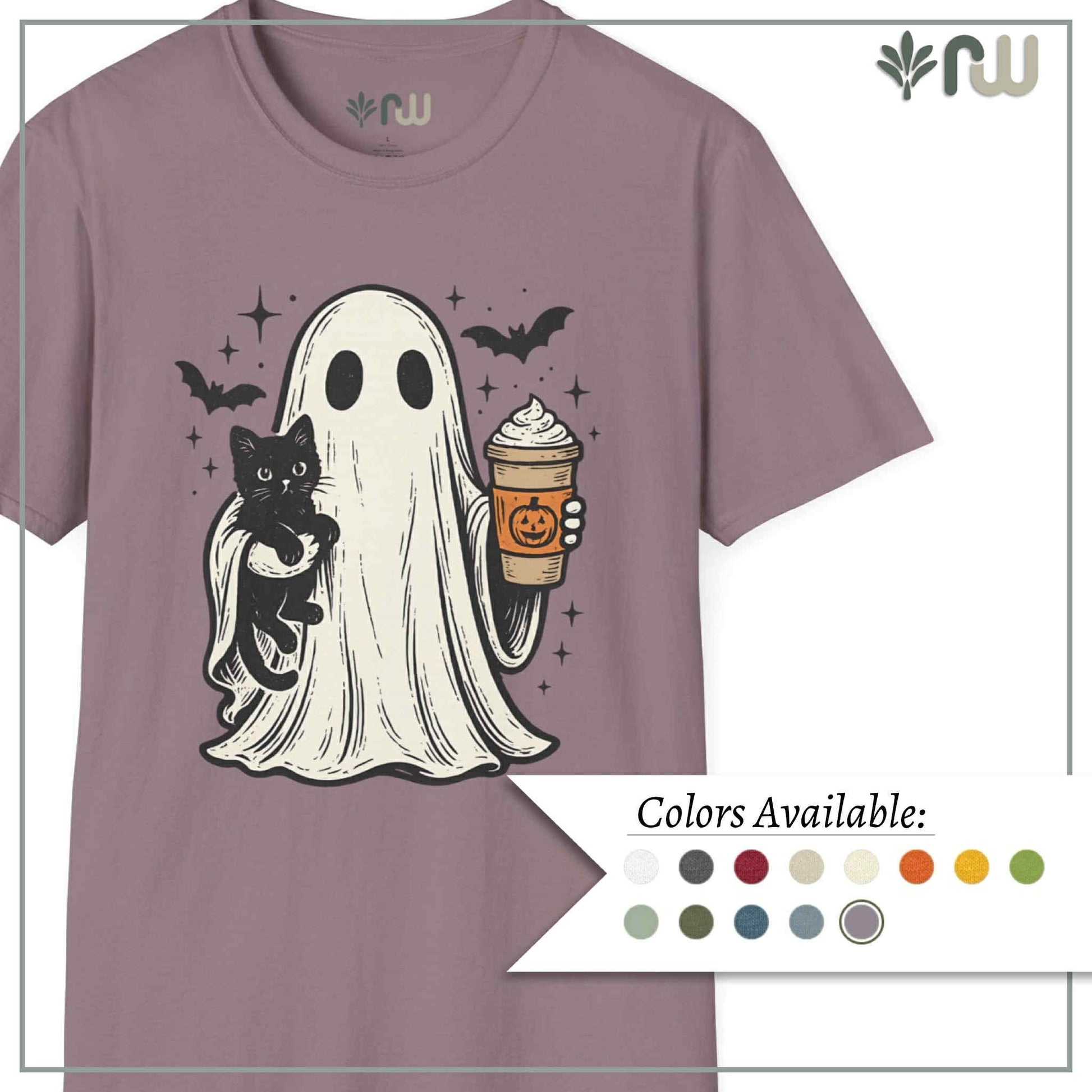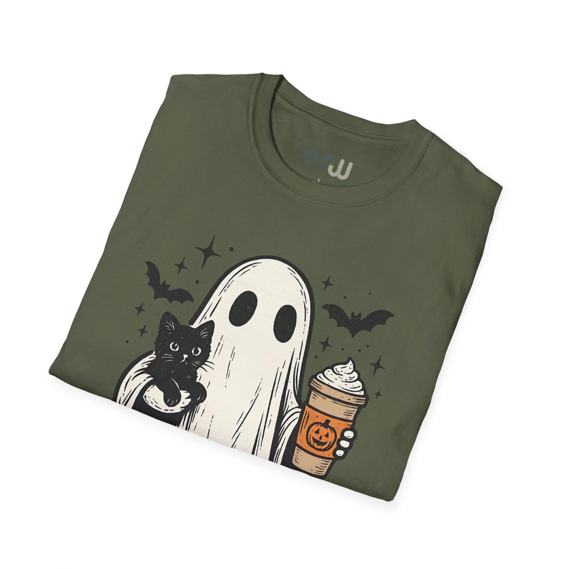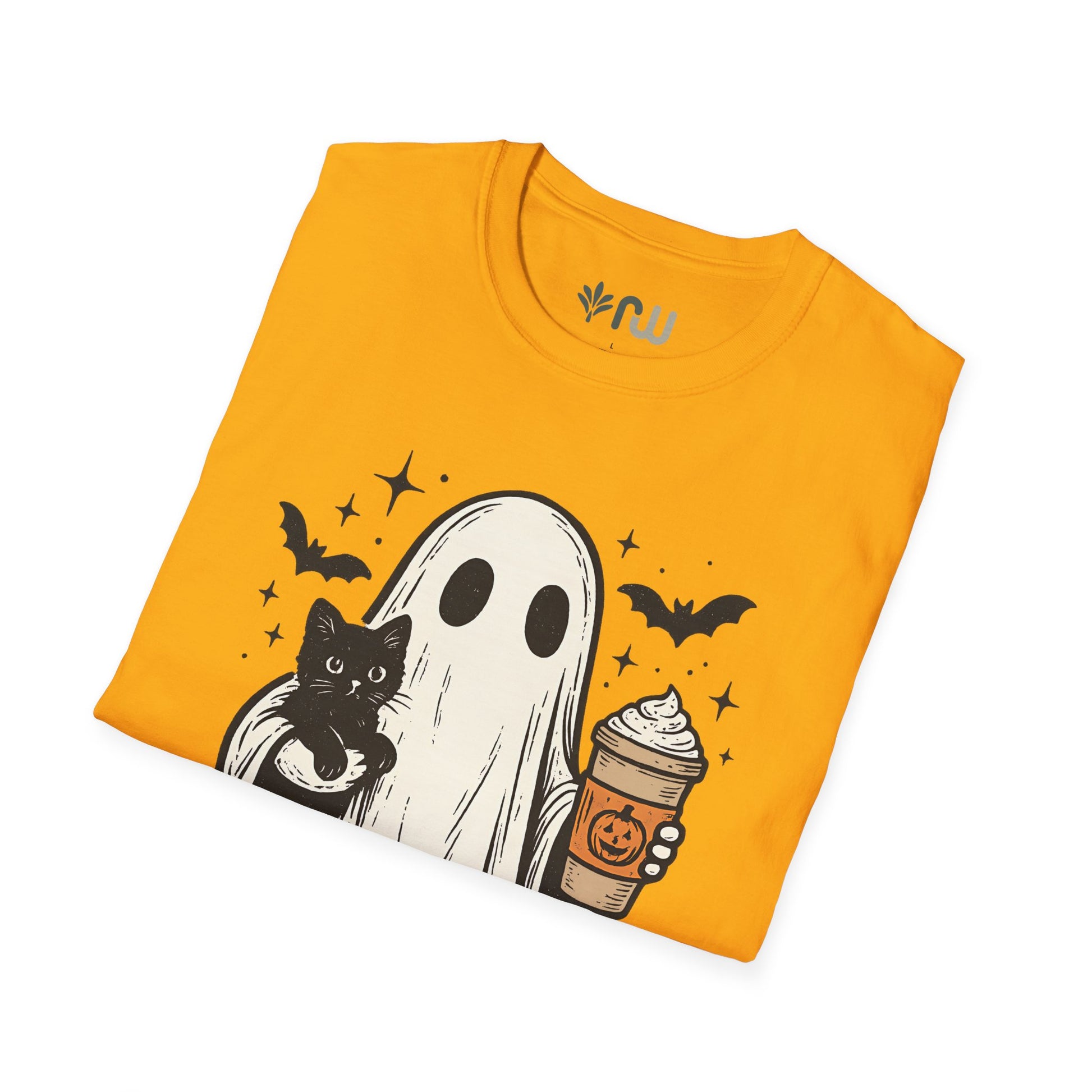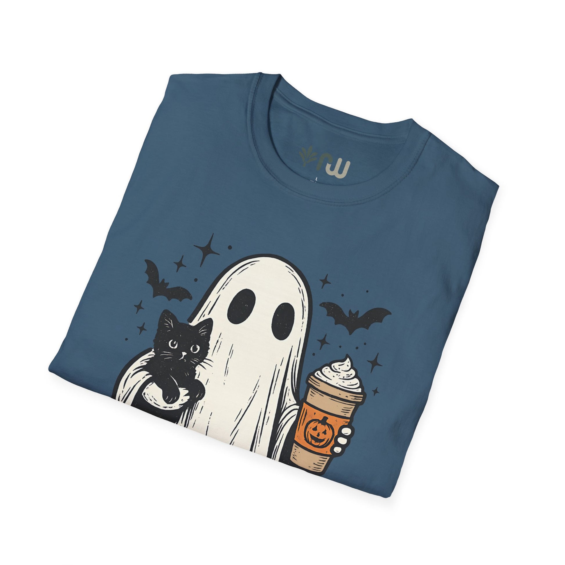 Embrace the spooky spirit of fall with this T-shirt, inspired by the cozy and eerie charm of Halloween. This stylish tee features a whimsical illustration of a ghost cradling a cat while holding a pumpkin latte, capturing the perfect blend of cute and creepy. Crafted from soft, comfortable fabric, this T-shirt is ideal for crisp autumn days, whether you're sipping a pumpkin spice latte or reveling in the Halloween season. Wear it, love it, and haunt the season in style!