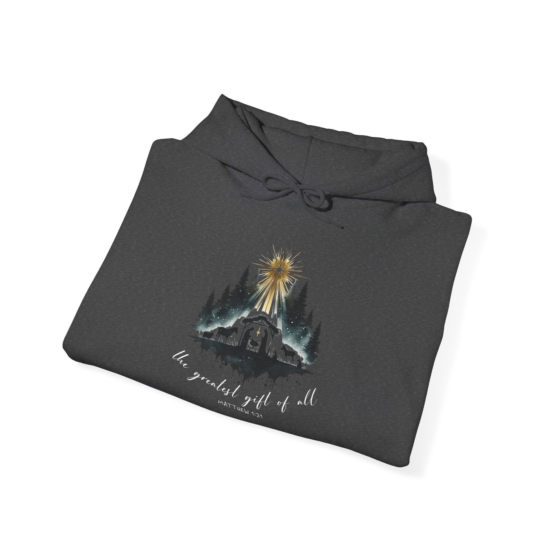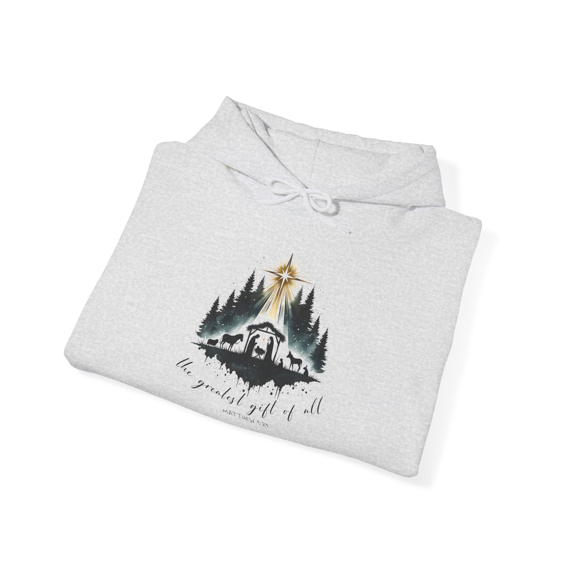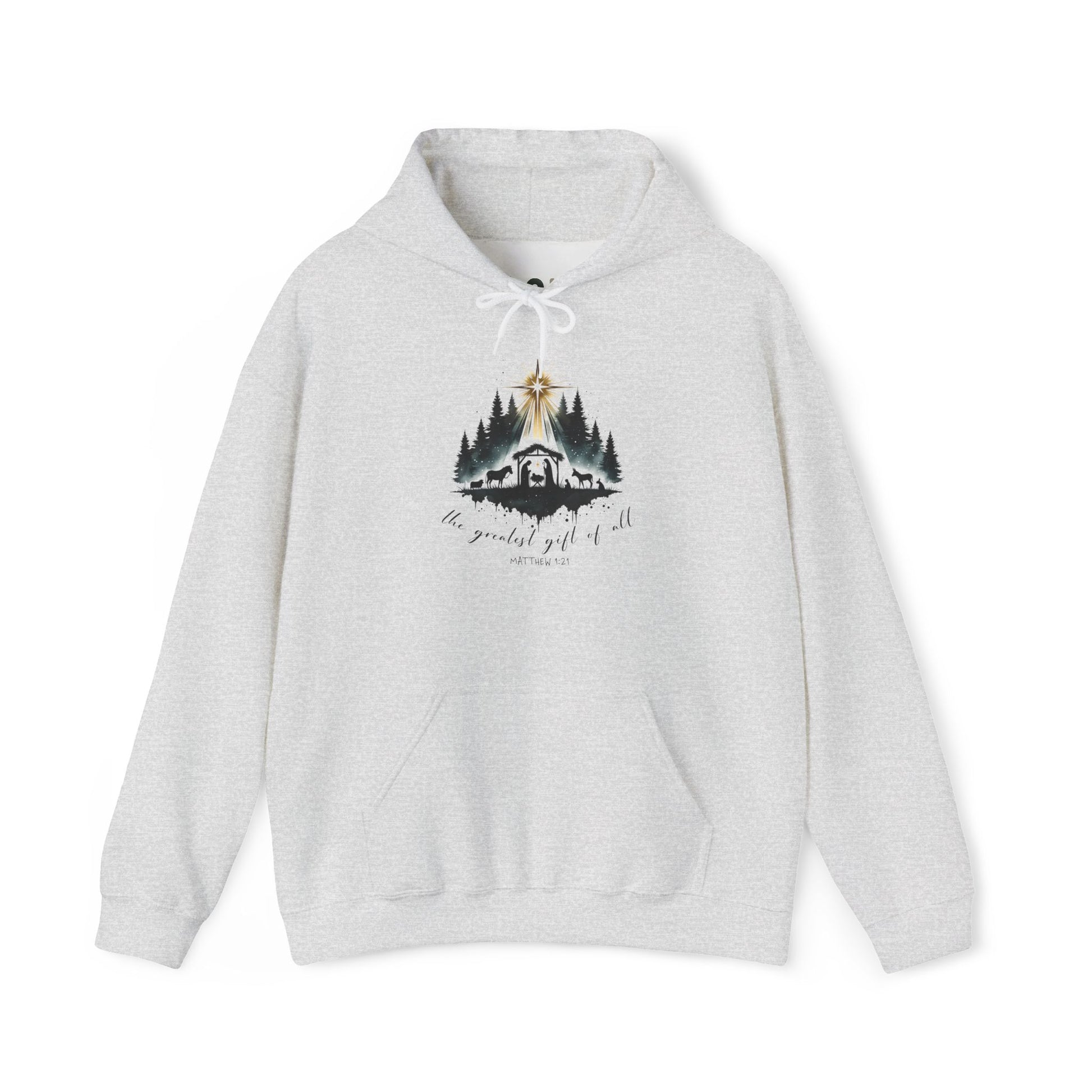 Cozy up in the true spirit of Christmas with our "Greatest Gift of All" hoodie, a beautiful blend of faith, comfort, and holiday wonder. Crafted from a soft, breathable cotton-blend, this unisex hoodie offers a relaxed fit and all-day warmth perfect for the winter season. The stunning design features a serene watercolor nativity scene—silhouetted manger, animals, and pines beneath a radiant Bethlehem star—paired with the elegant handwritten script "The greatest gift of all" and the Bible reference "MATTHEW 2:11" below. Ideal for Christmas Eve services, family gatherings, cozy nights by the fire, or gifting to those who cherish the reason for the season, this hoodie is a meaningful and stylish way to celebrate the birth of Christ all winter long.