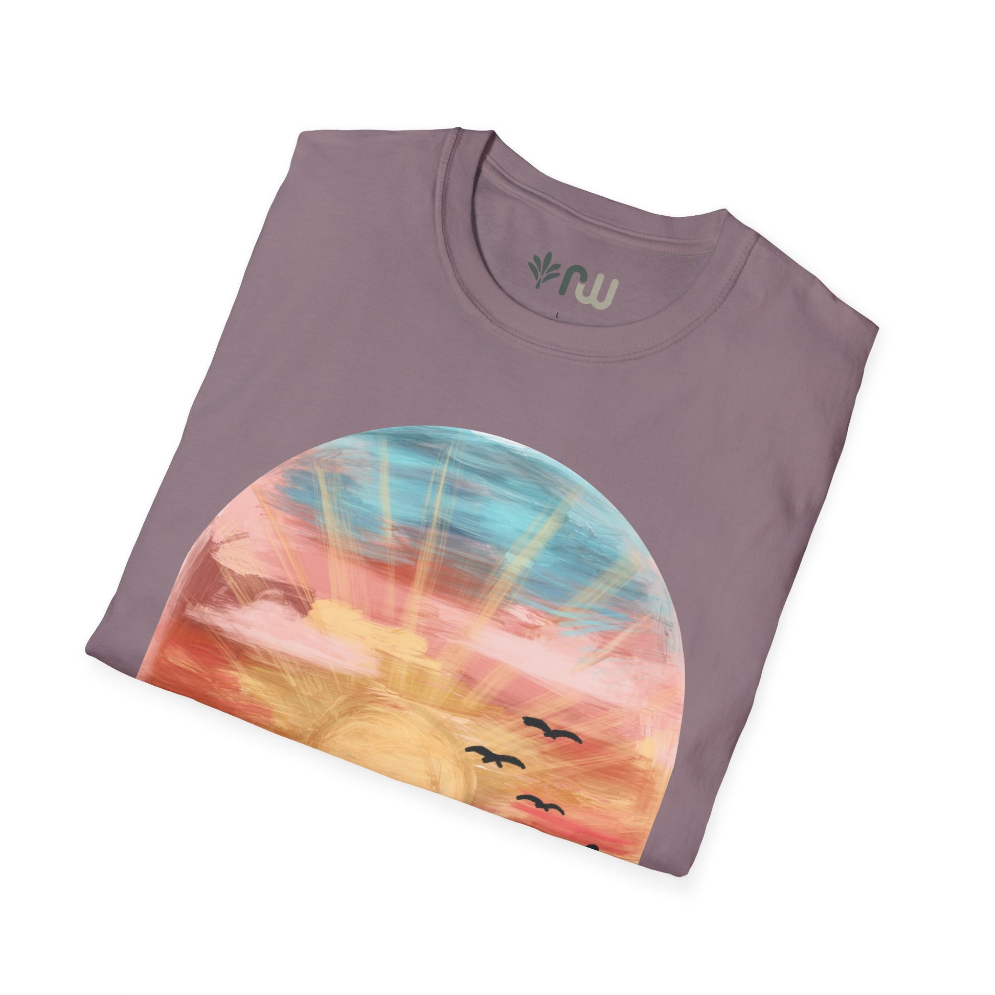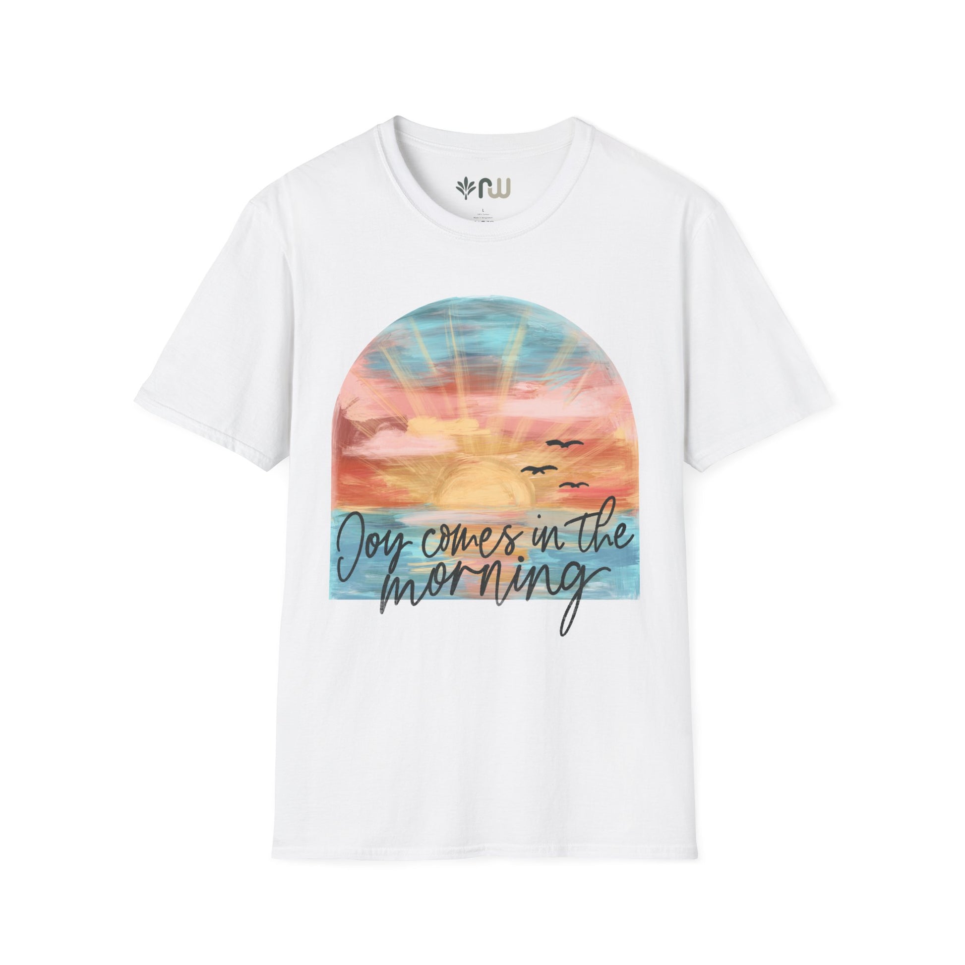 A softstyle t-shirt featuring a sunrise scene with the words, 'Joy comes in the morning'. This t-shirt is made with 100% ring-spun cotton, making it a lightweight and comfortable option for year-round wear. The classic fit and crew neckline offer a versatile style suitable for any occasion, whether formal or casual. Perfect for adults looking for a soft and durable t-shirt with a meaningful design.