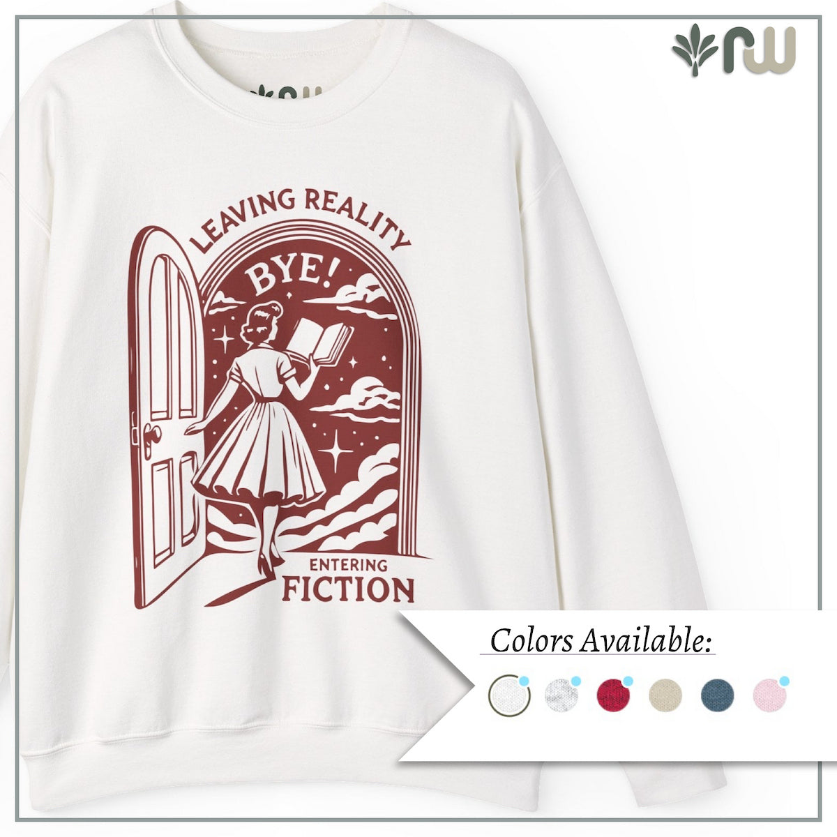 Escape into the world of stories with our cozy "Leaving Reality, Entering Fiction" sweatshirt. This unisex sweatshirt features a vibrant graphic of a girl engrossed in a book, stepping through a door into a realm of imagination. The bold, message across the chest declares your love for getting lost in fiction. Perfect for book lovers, dreamers, and anyone who cherishes the magic of a good story.