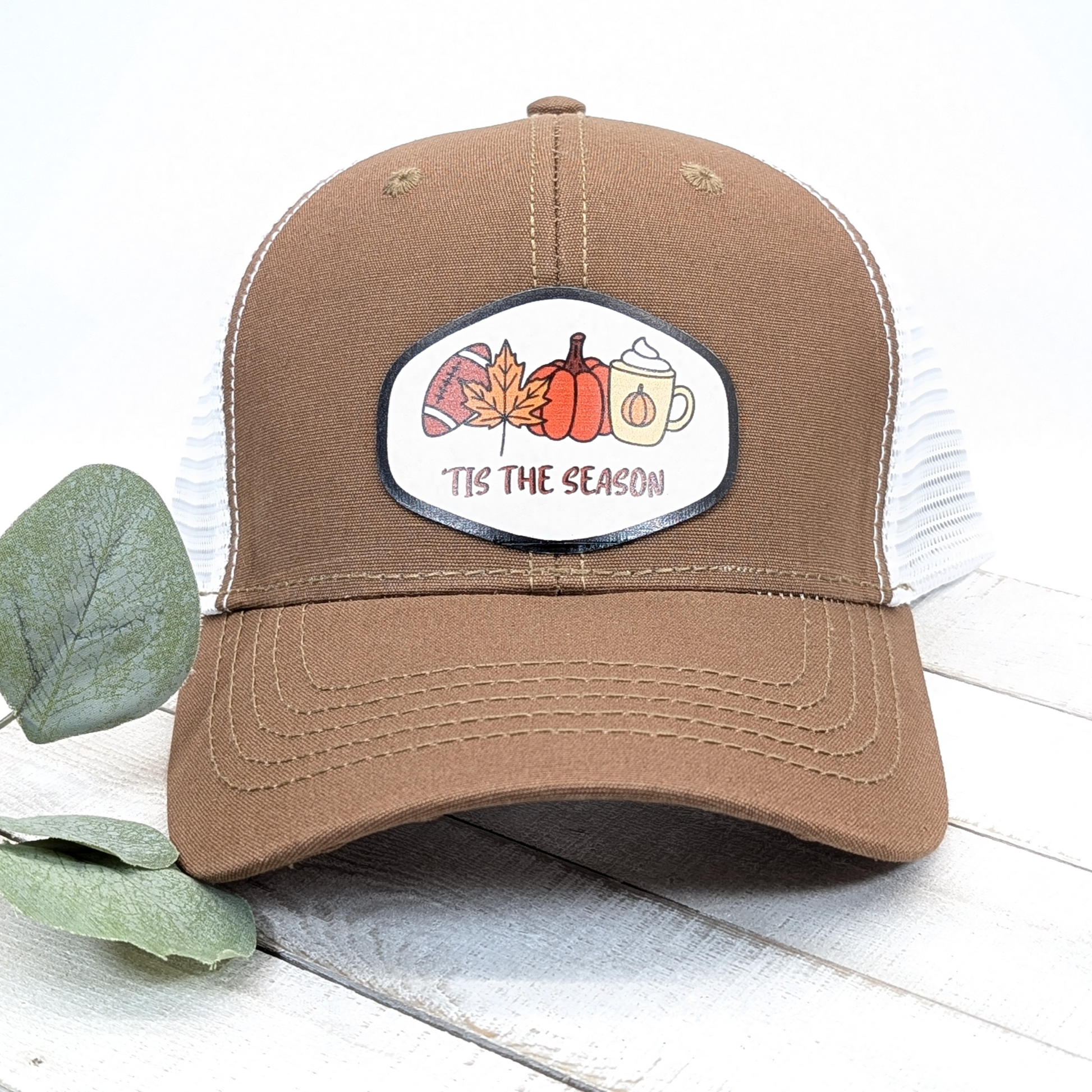 "Tis the Season" Fall Themed Women's Modern Trucker Ponytail Hat. Choose your color.