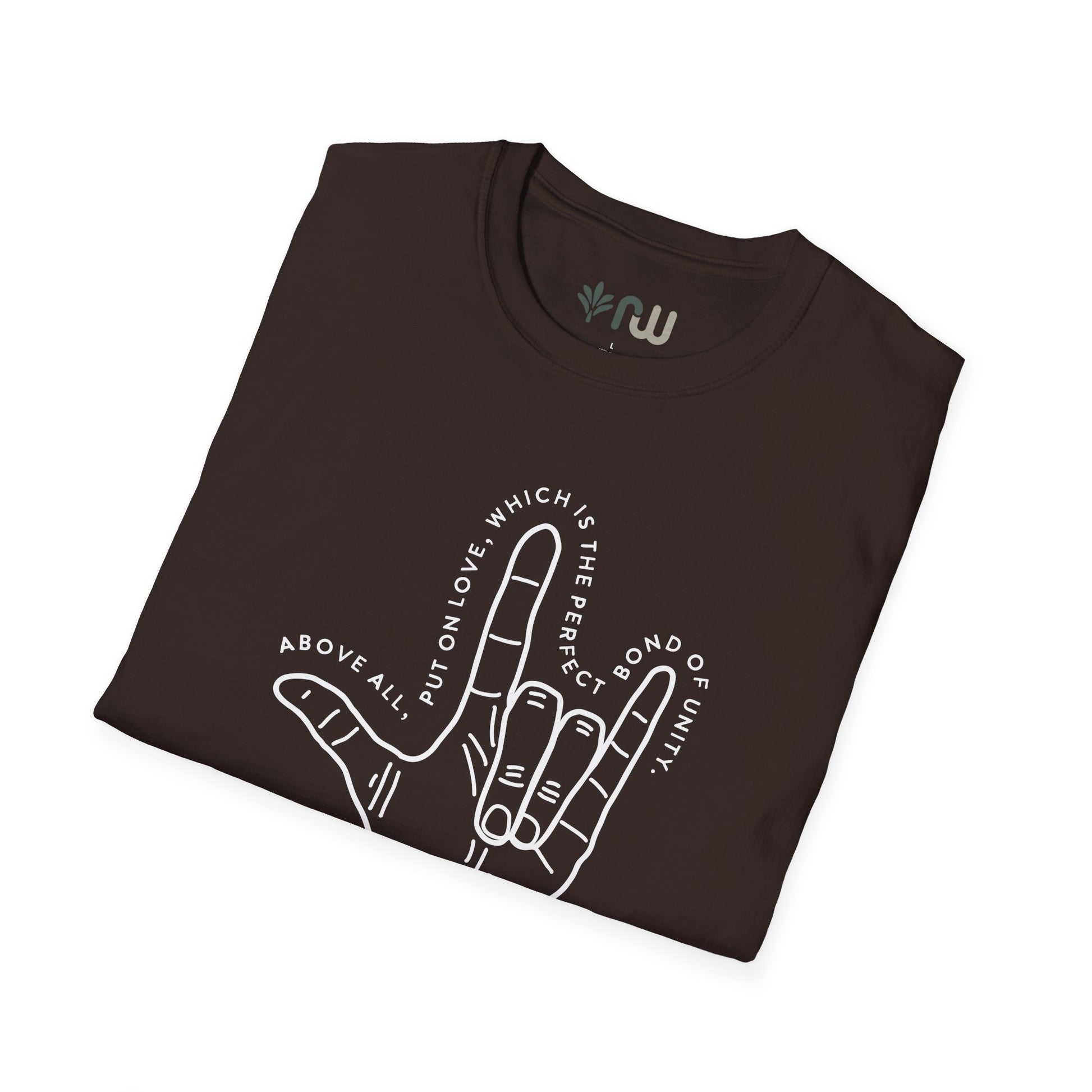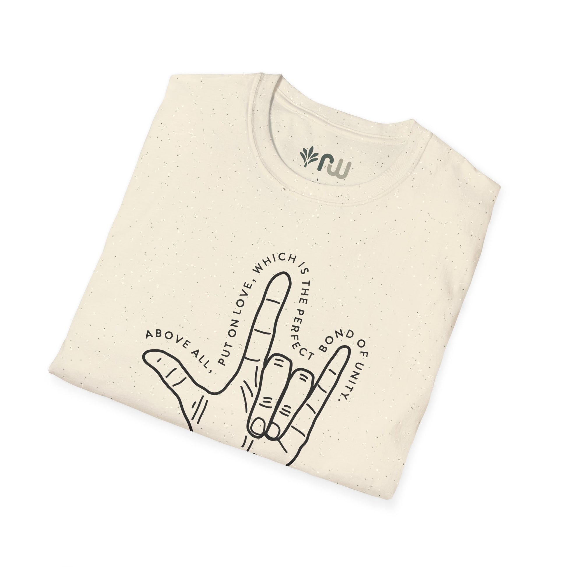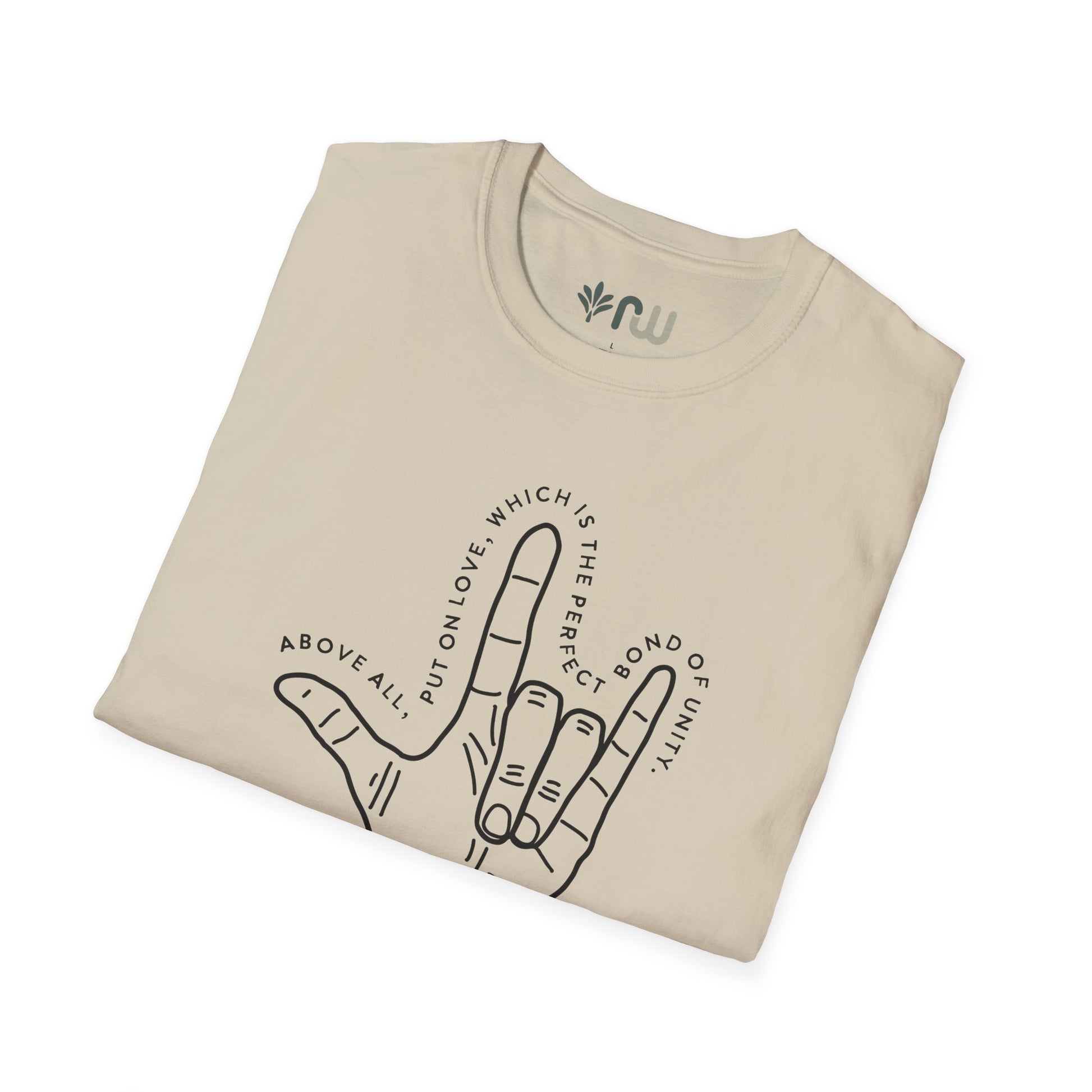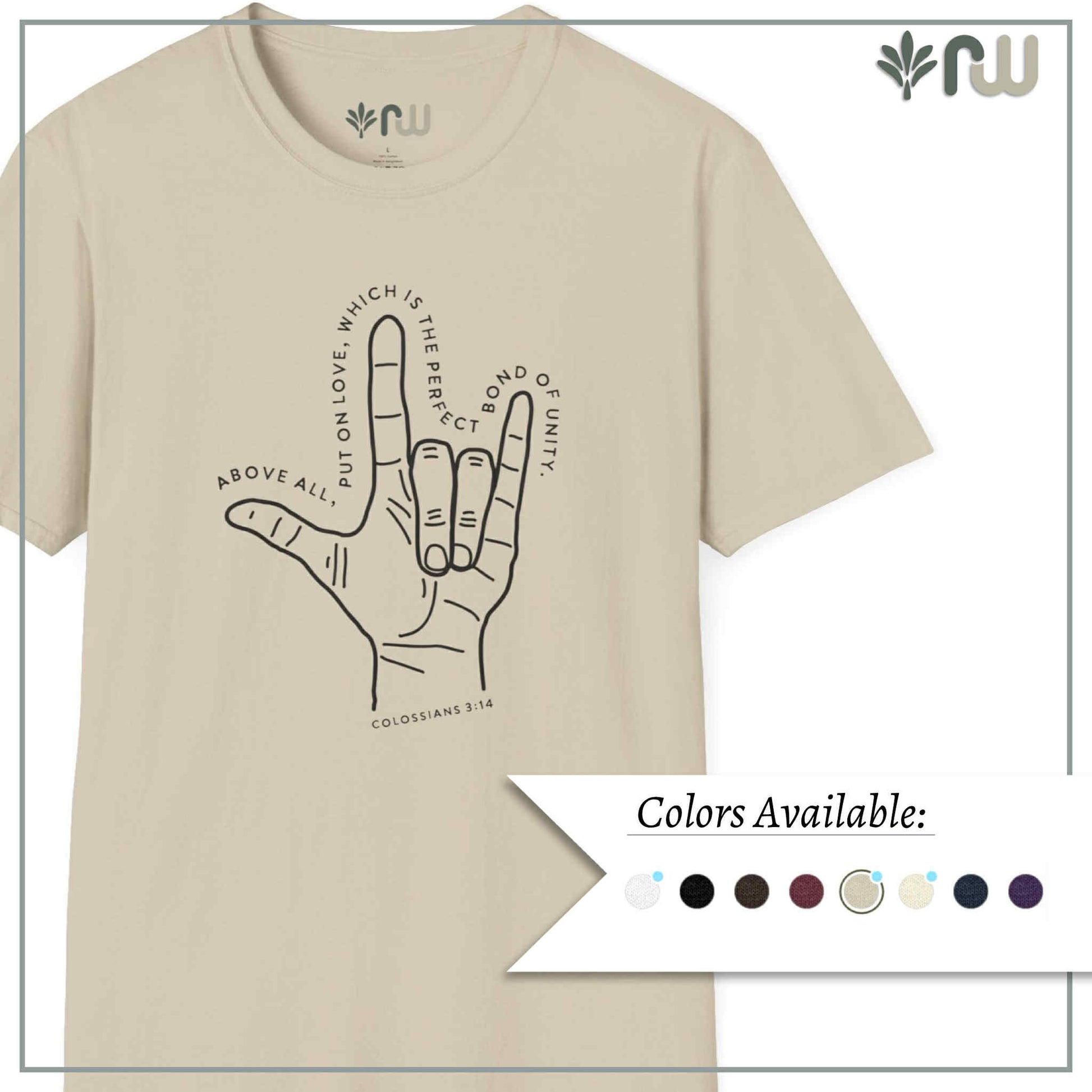 Spread the message of unity and love with this T-shirt, inspired by the timeless wisdom of Colossians 3:14. This stylish tee features a heartfelt design of a hand signing "love" in sign language, symbolizing the bond of compassion and grace. Crafted from soft, comfortable fabric, it’s perfect for everyday wear, whether you're sharing kindness or embracing the spirit of togetherness. Wear it, cherish it, and inspire love in style!