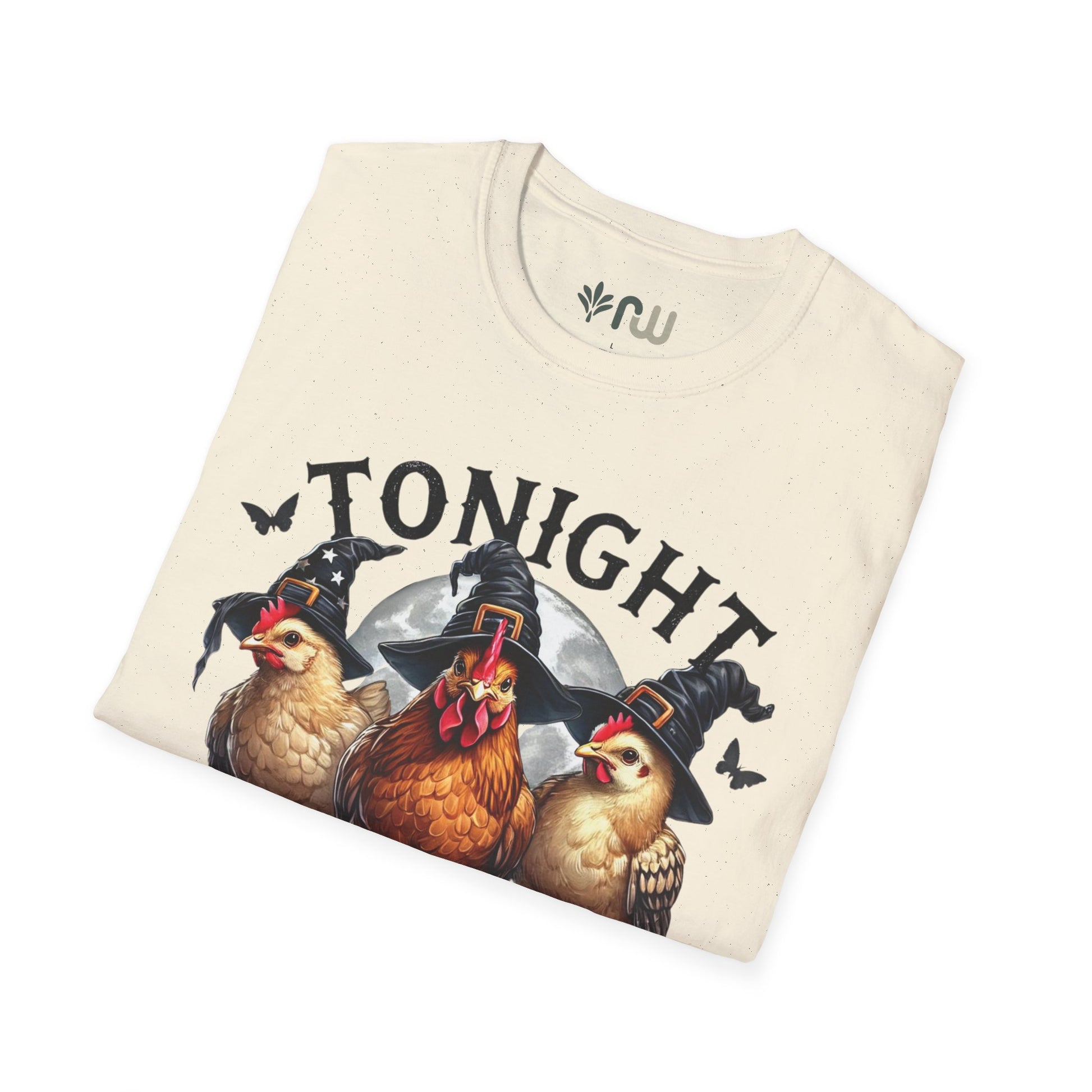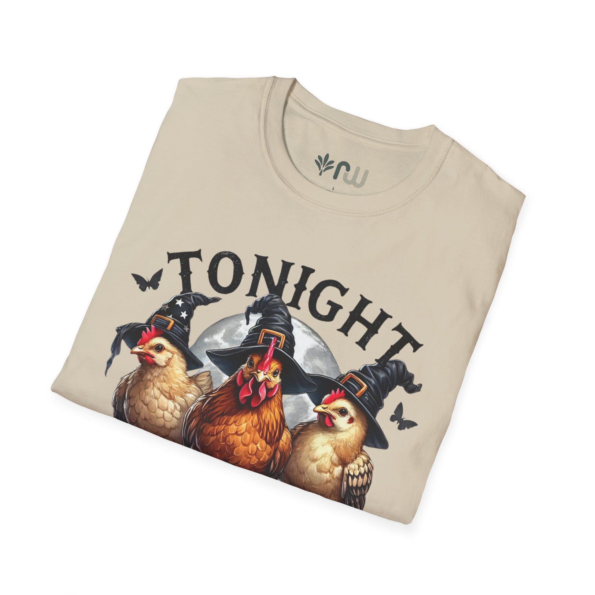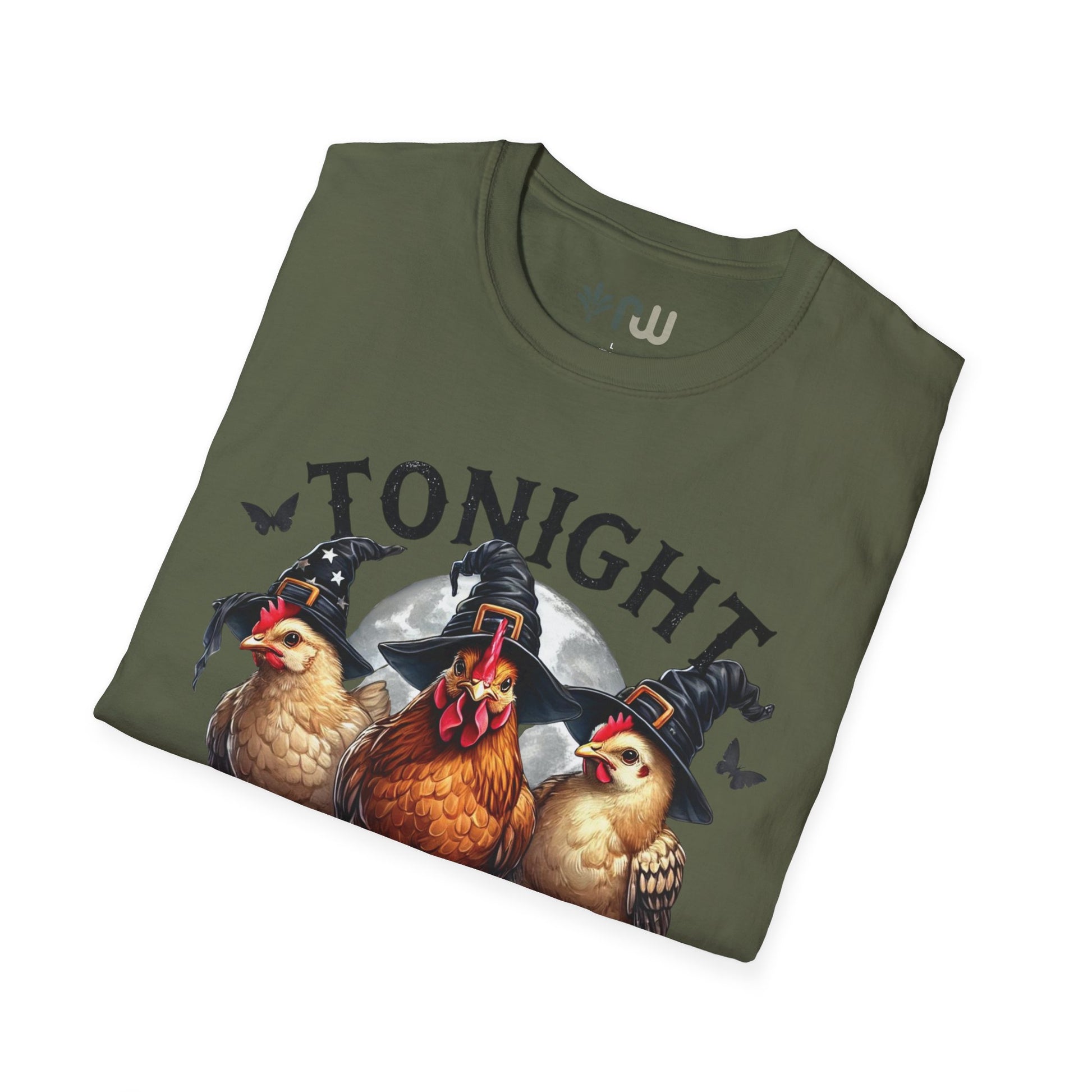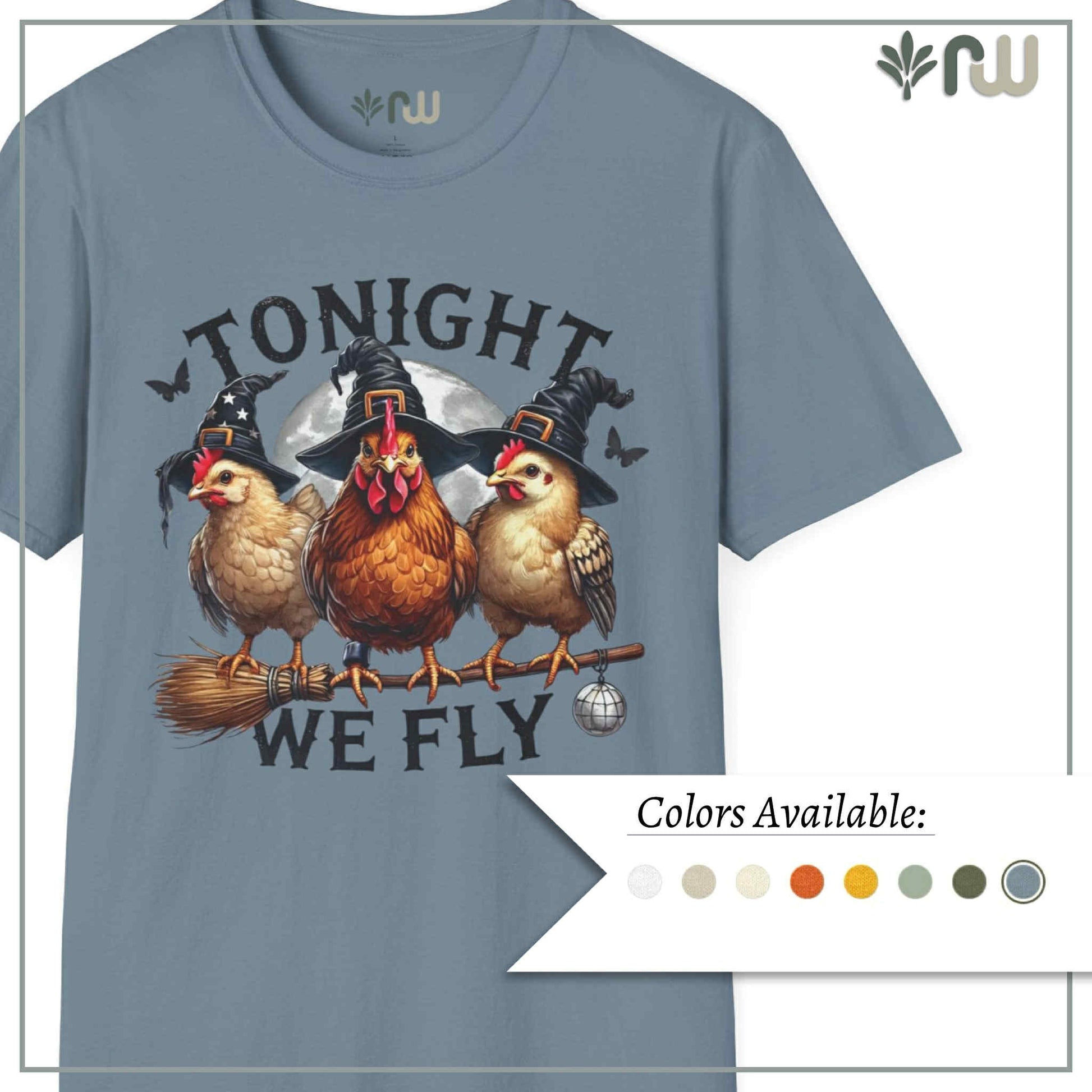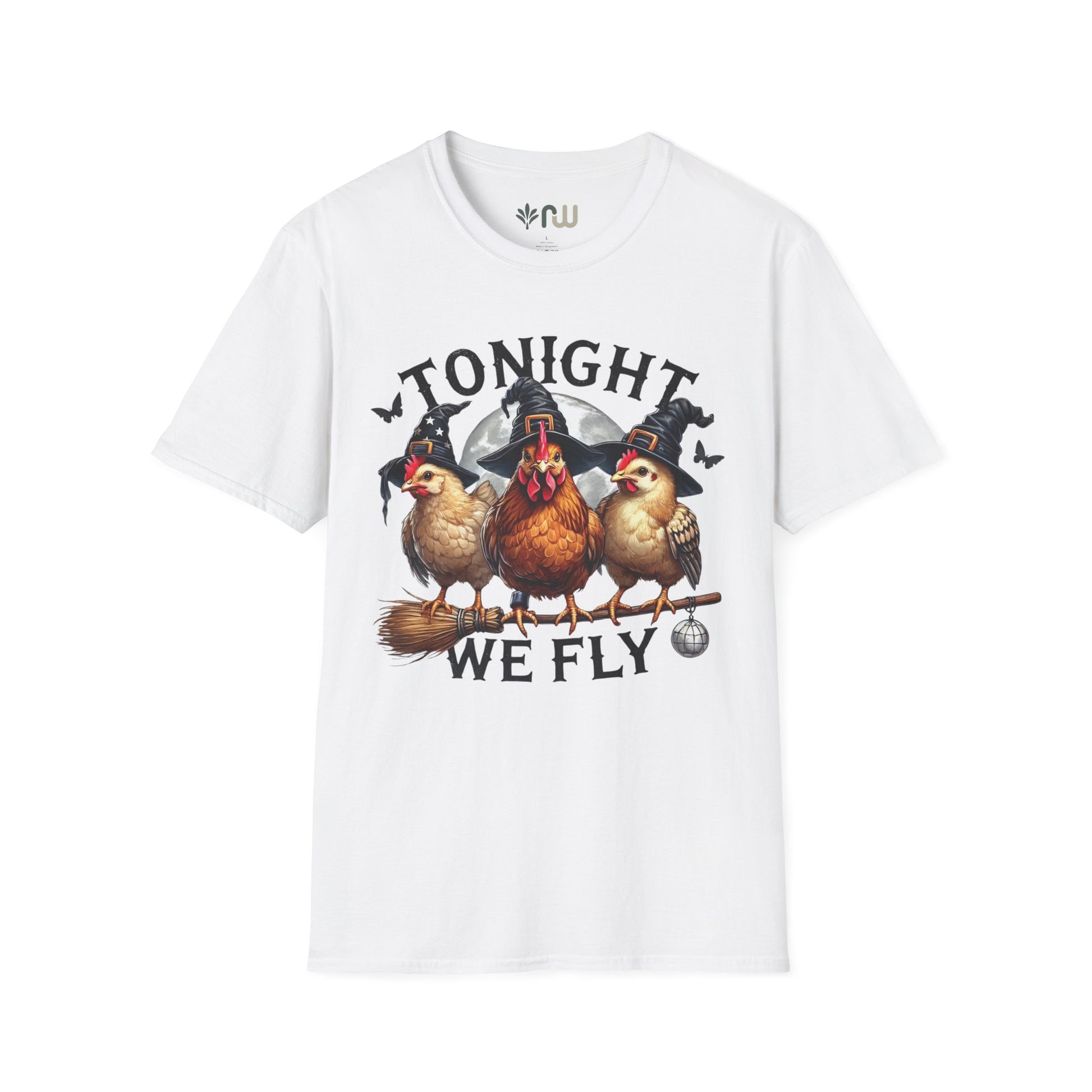 Get ready for a whimsical fall adventure with our "Tonight, We Fly" T-shirt, inspired by the playful magic of Halloween. This stylish tee features the bold phrase "Tonight, We Fly" in a spooky, eye-catching text design, accompanied by a charming illustration of chickens donning witch hats, perched on a broom. Crafted from soft, comfortable fabric, this T-shirt is perfect for crisp autumn days, whether you're embracing the Halloween spirit or enjoying a festive night out. Wear it, love it, and soar into the season!