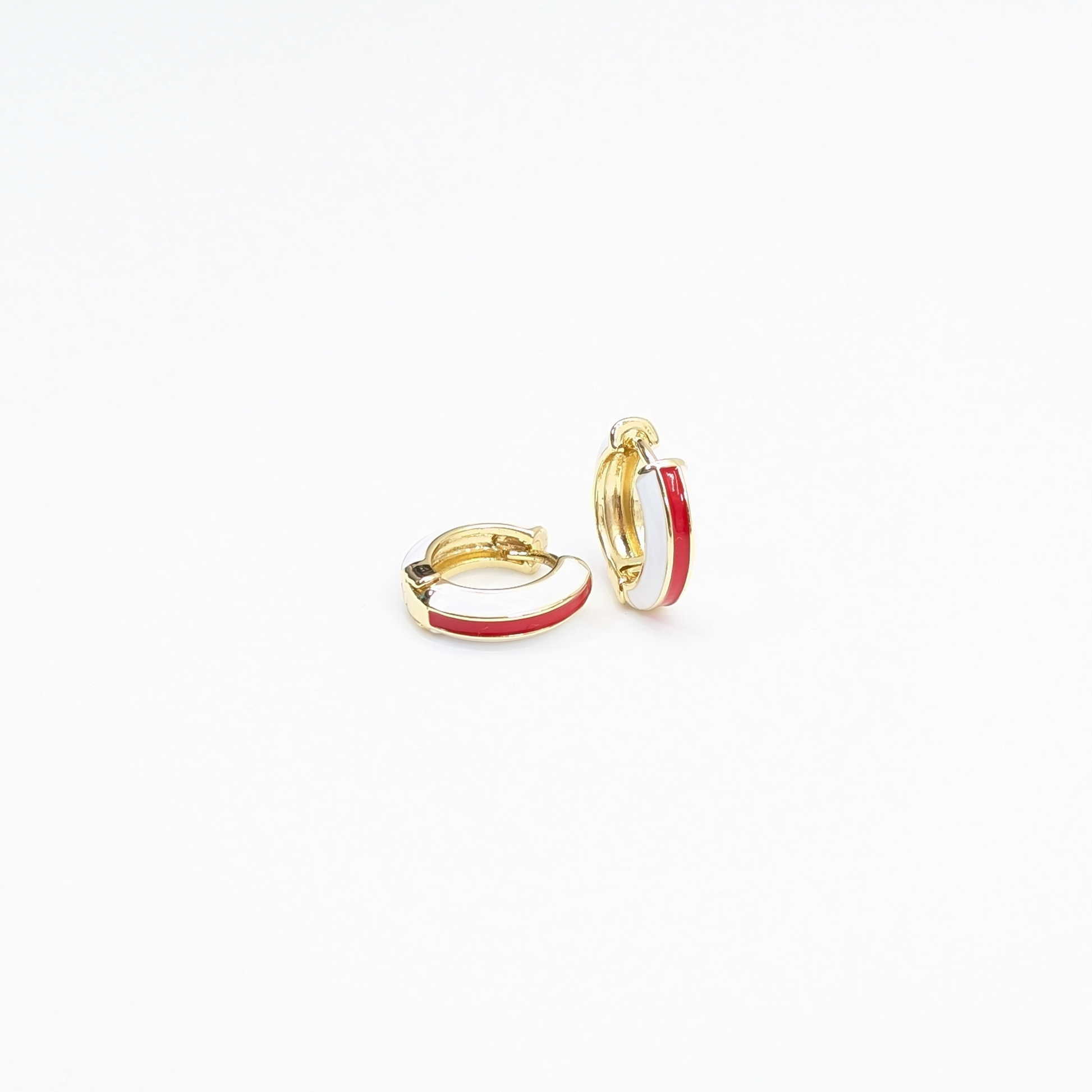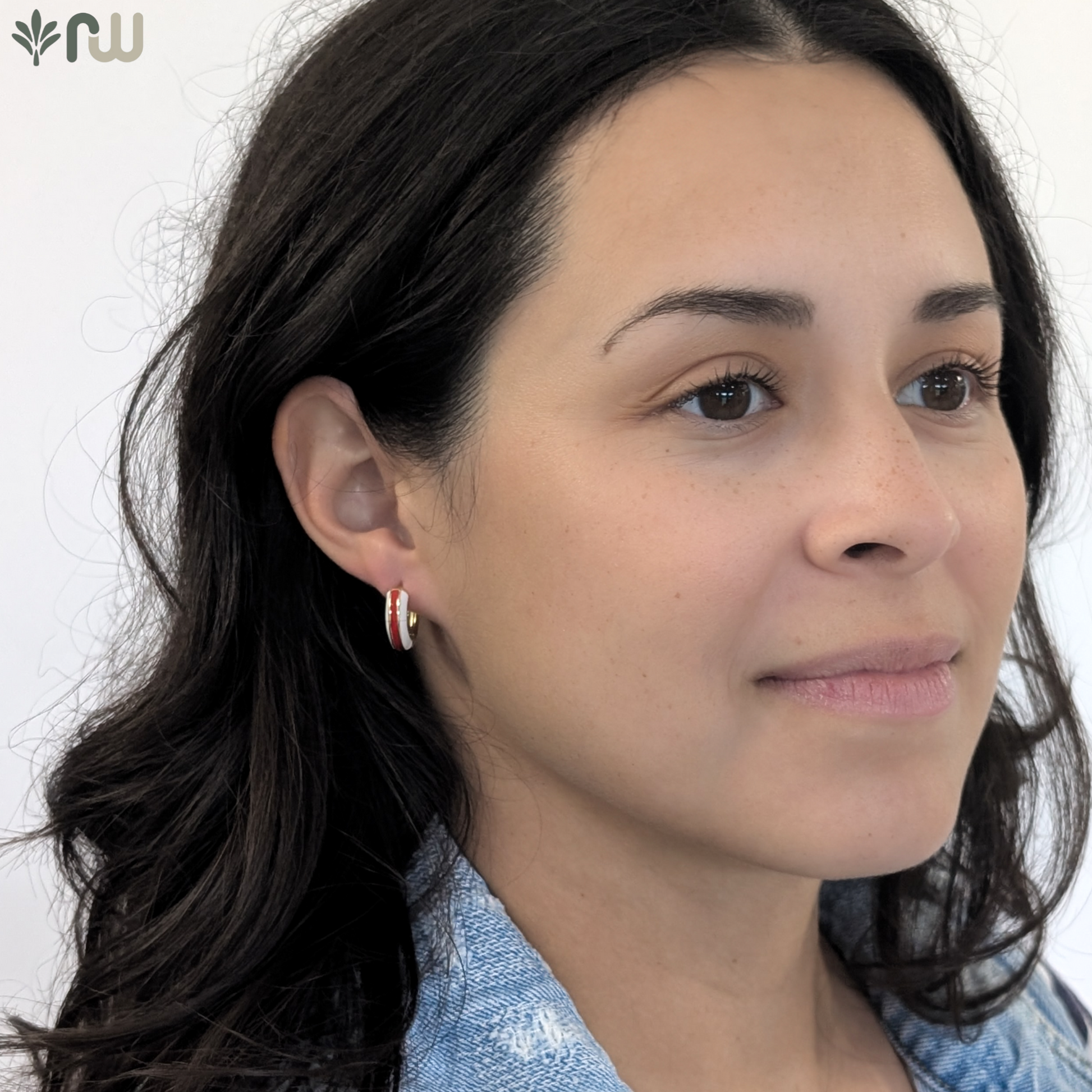 Red and White Huggie Hoop Earrings with Gold Metal.