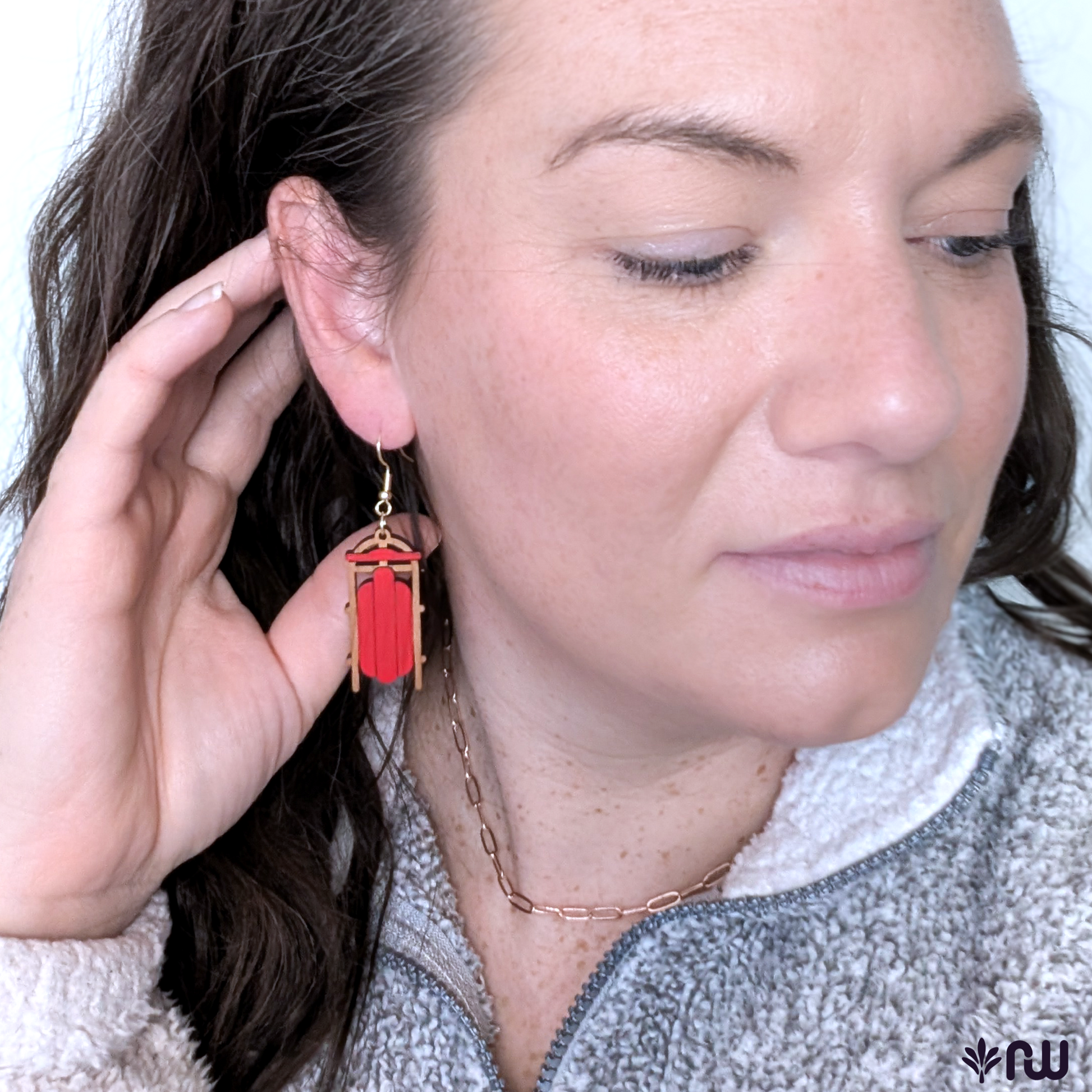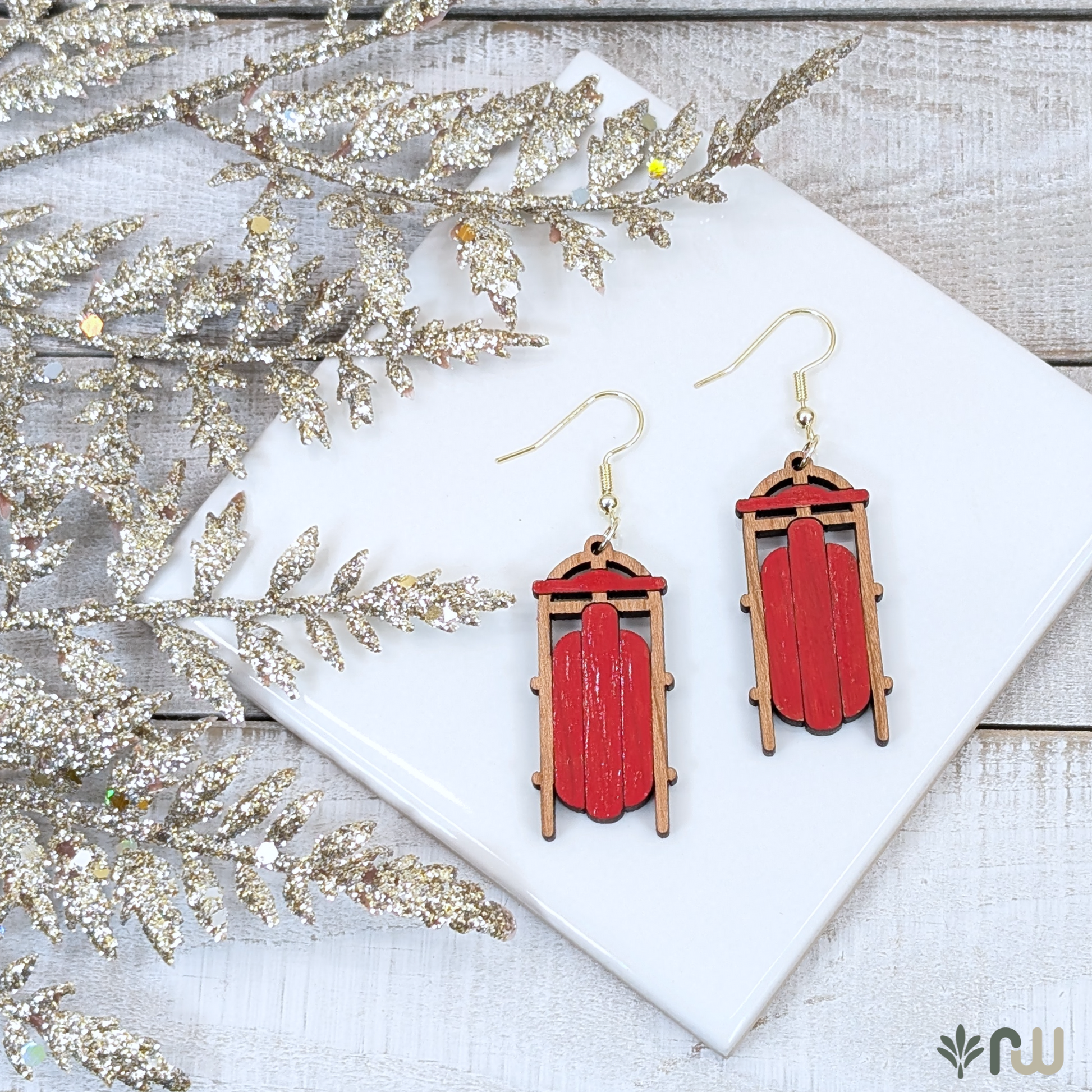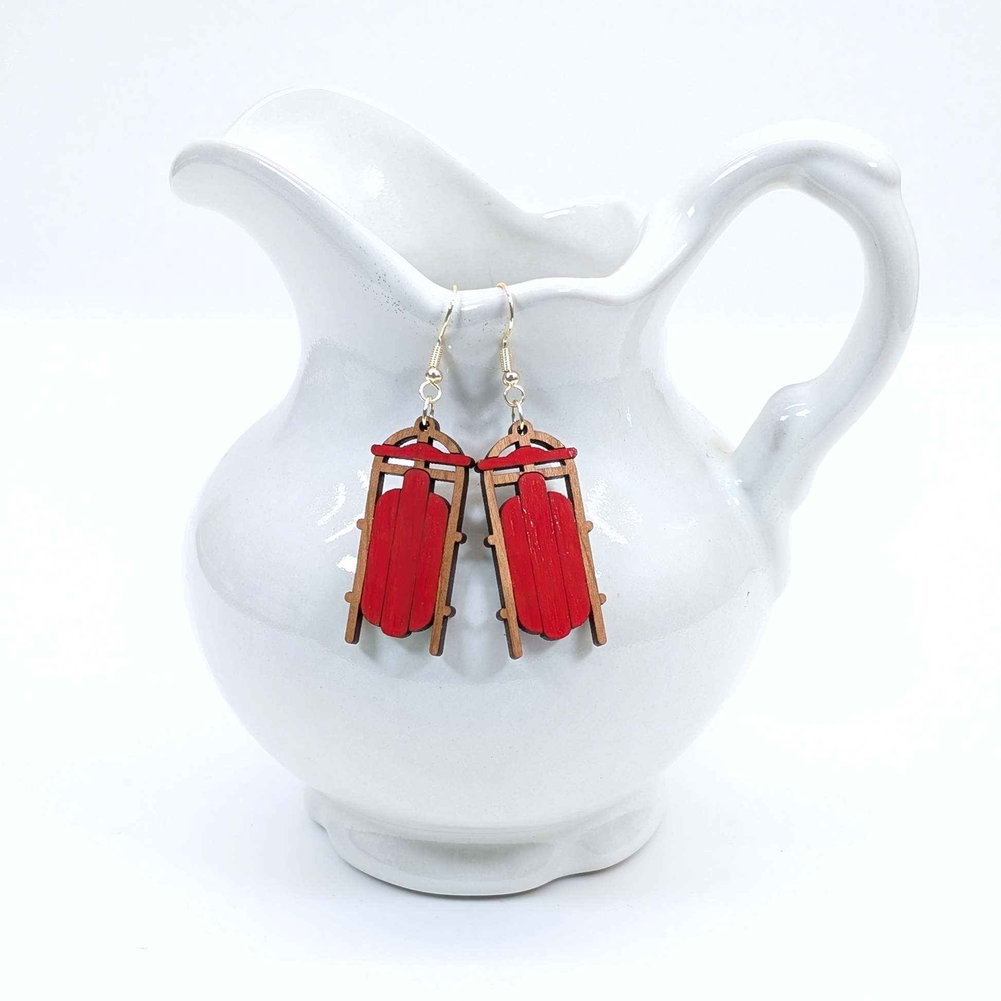 Etched and Painted Cherry Wood Sled Earrings.