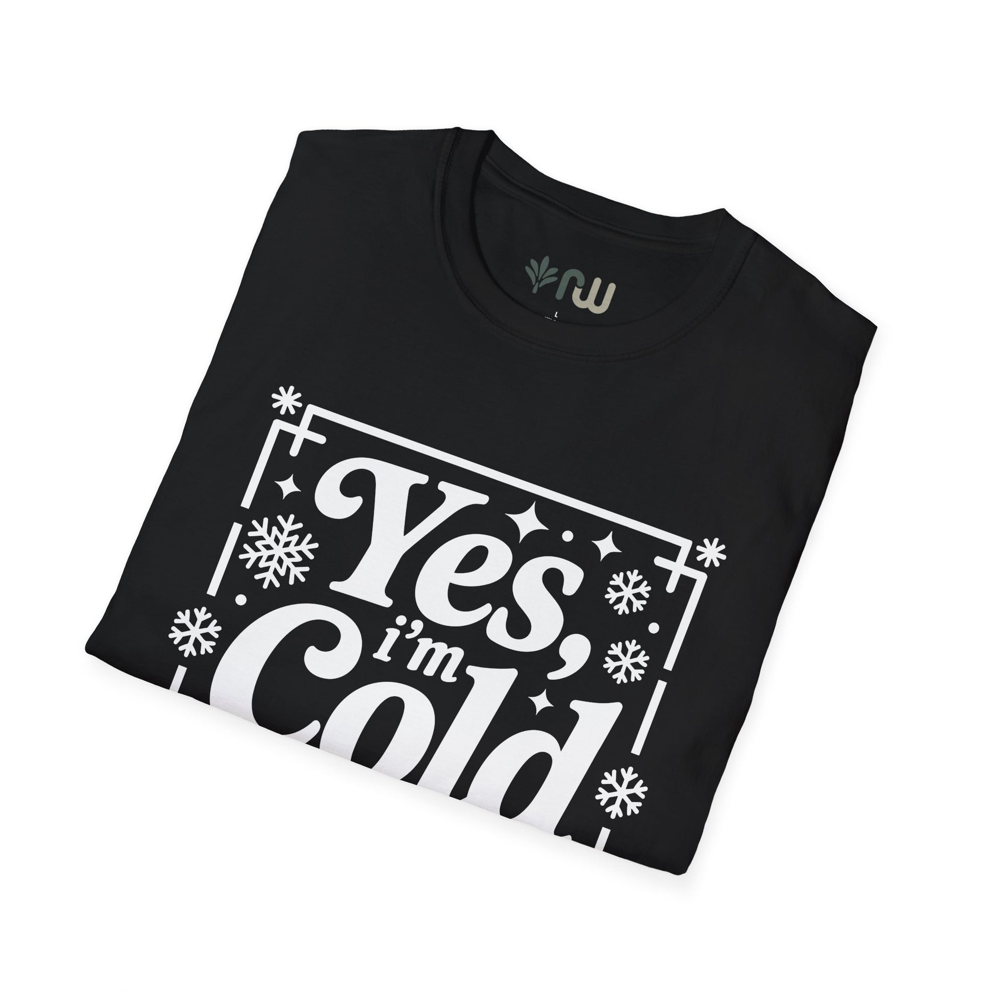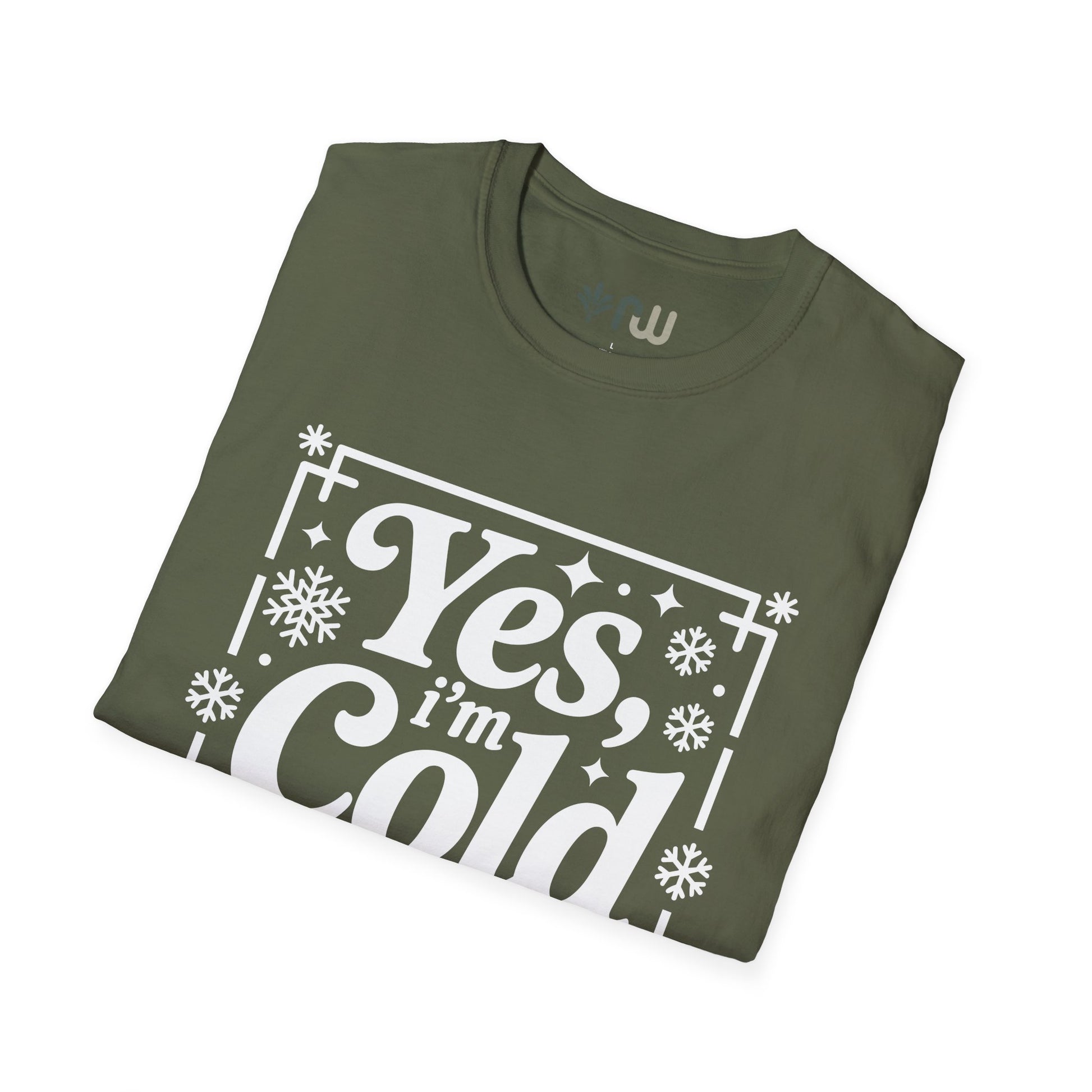 Rock that perpetually freezing vibe with our "Yes, I'm Cold" t-shirt—the perfect mix of humor, comfort, and winter realness. Crafted from soft, breathable 100% ring-spun cotton, this unisex tee has a lightweight, relaxed fit that's made for layering under jackets or wearing solo when you still need to announce your internal temperature. The bold, playful design features "Yes, I'm Cold" in chunky retro lettering, surrounded by delicate snowflakes and corner accents, with the hilariously relatable subtitle "I'M ALWAYS COLD - ME 24/7" underneath. Ideal for holiday parties, running errands in the chill, or gifting to your fellow freeze-babies, this t-shirt is a trendy (and brutally honest) way to own your inner ice cube all winter long.